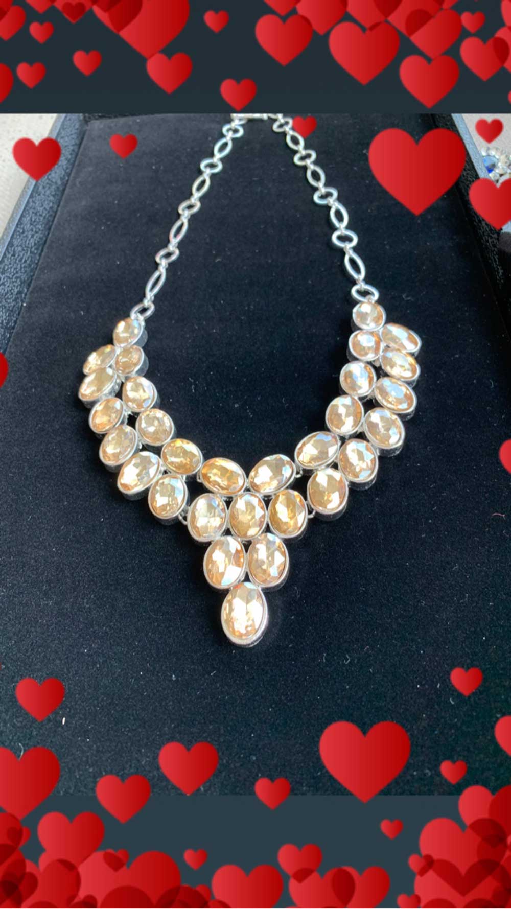 A silver necklace adorned with oval-cut faceted gemstones, sparkling gracefully in a romantic display of artistry.