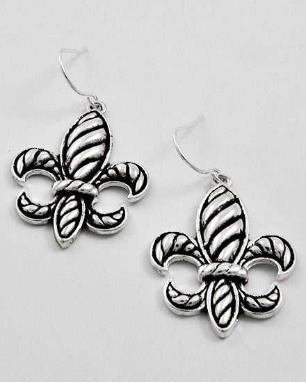 Intricate silver-toned fleur-de-lis earrings with black accents, radiating classic elegance.