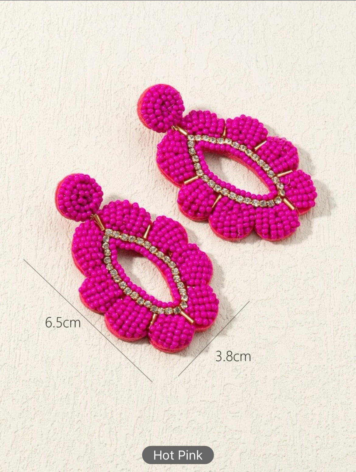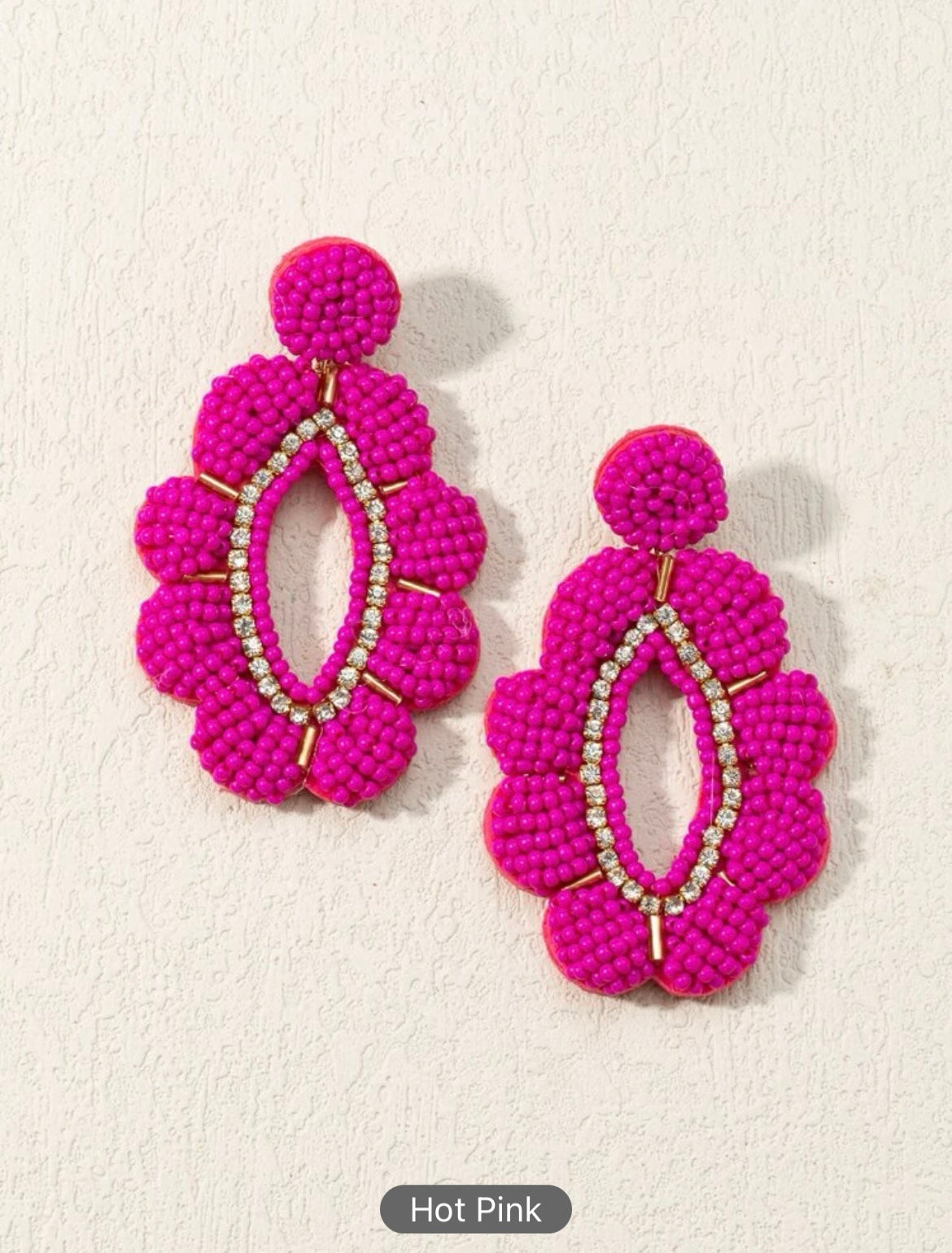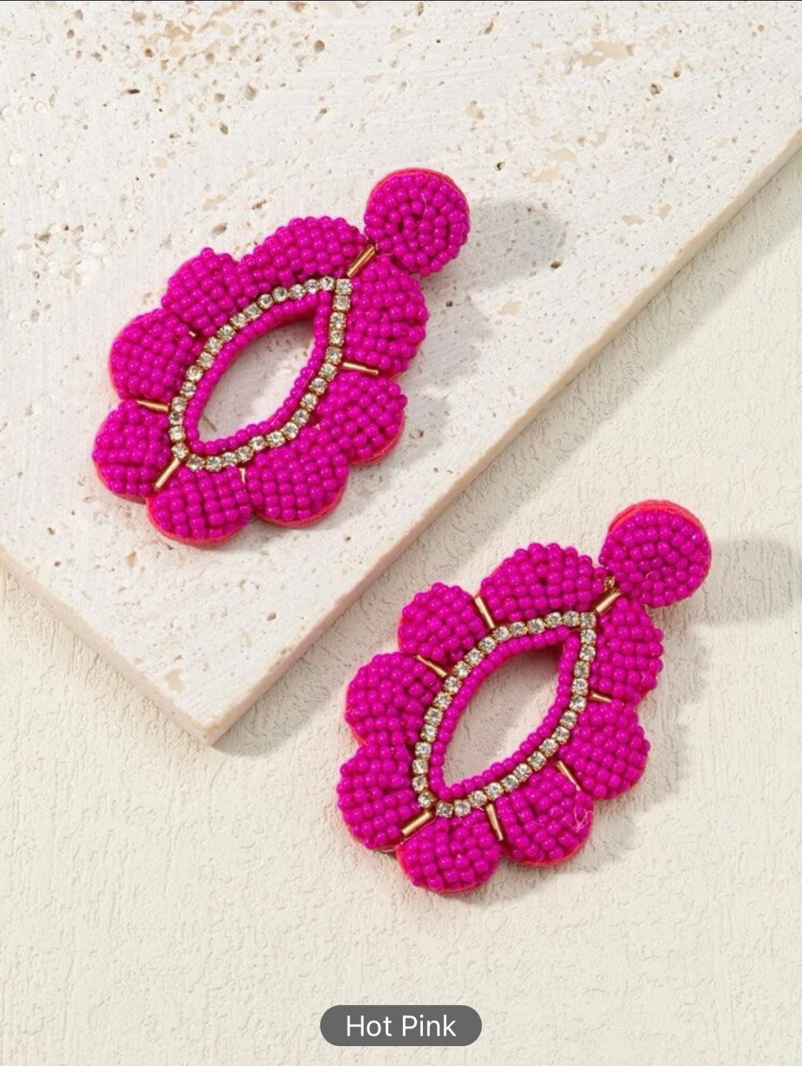 Hot pink earrings featuring circular studs and intricate petal-like designs adorned with rhinestones-vibrant elegance for any occasion.