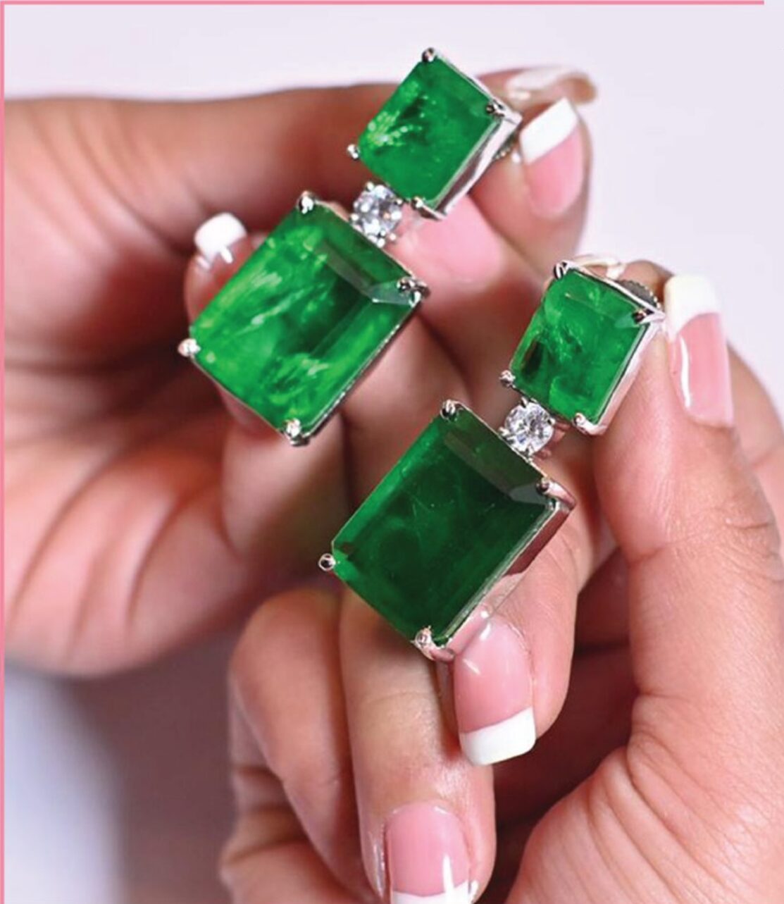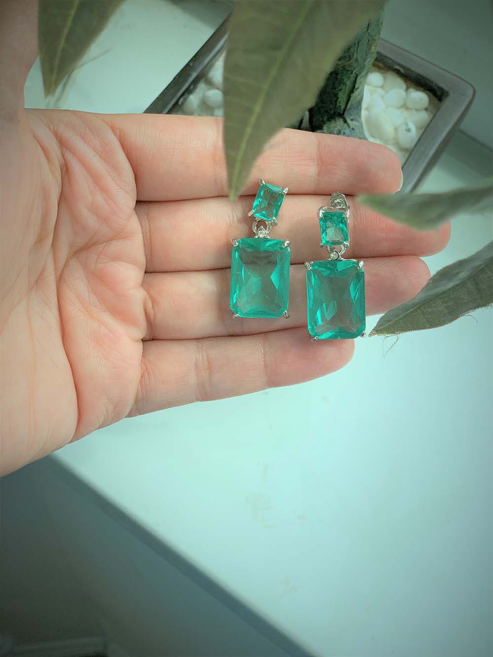 These earrings feature vivid green gemstones in square and rectangular cuts, elegantly set in silver for timeless sophistication. Their vibrant hues and sleek design make them a striking accessory for formal or everyday wear.