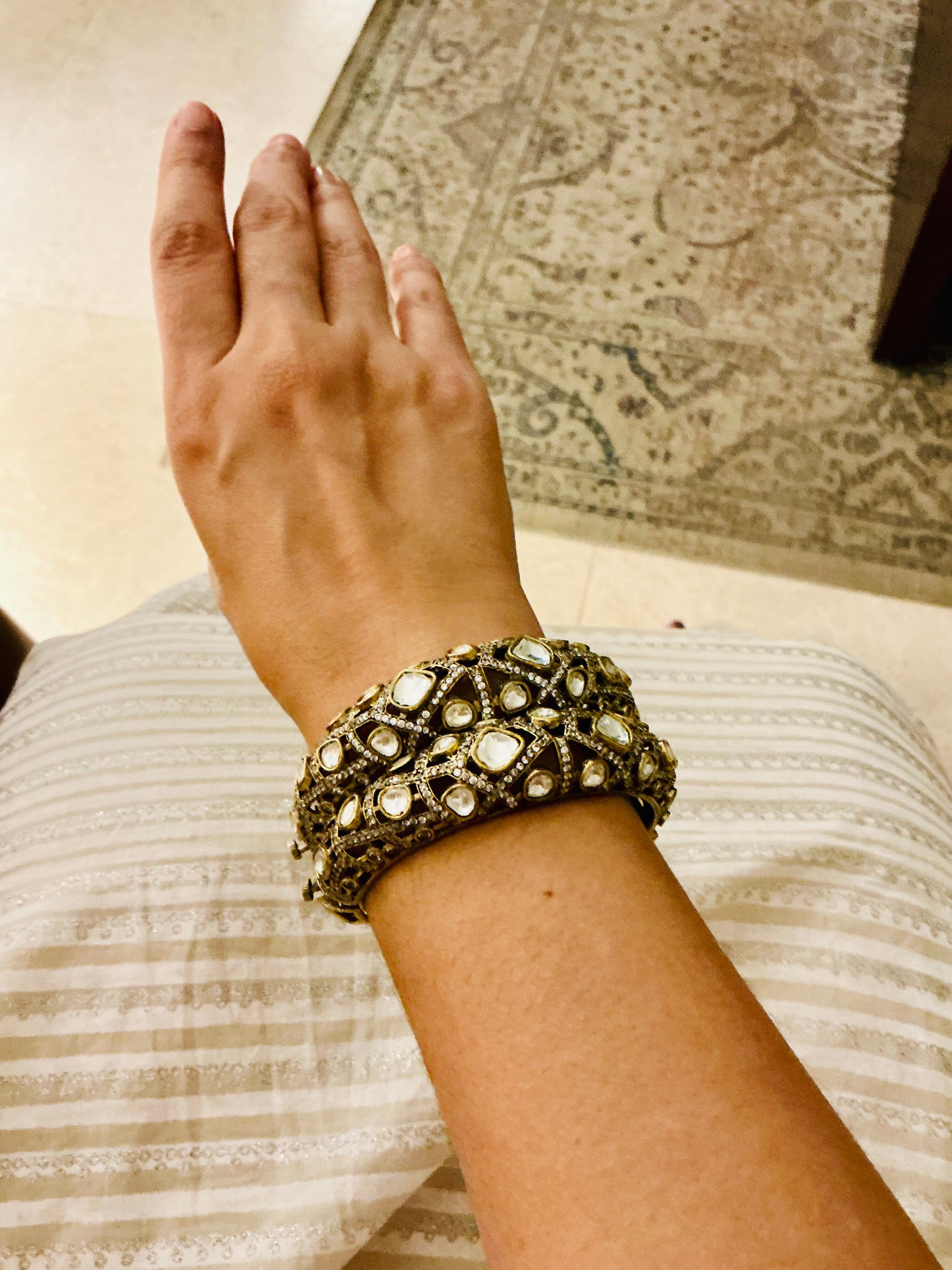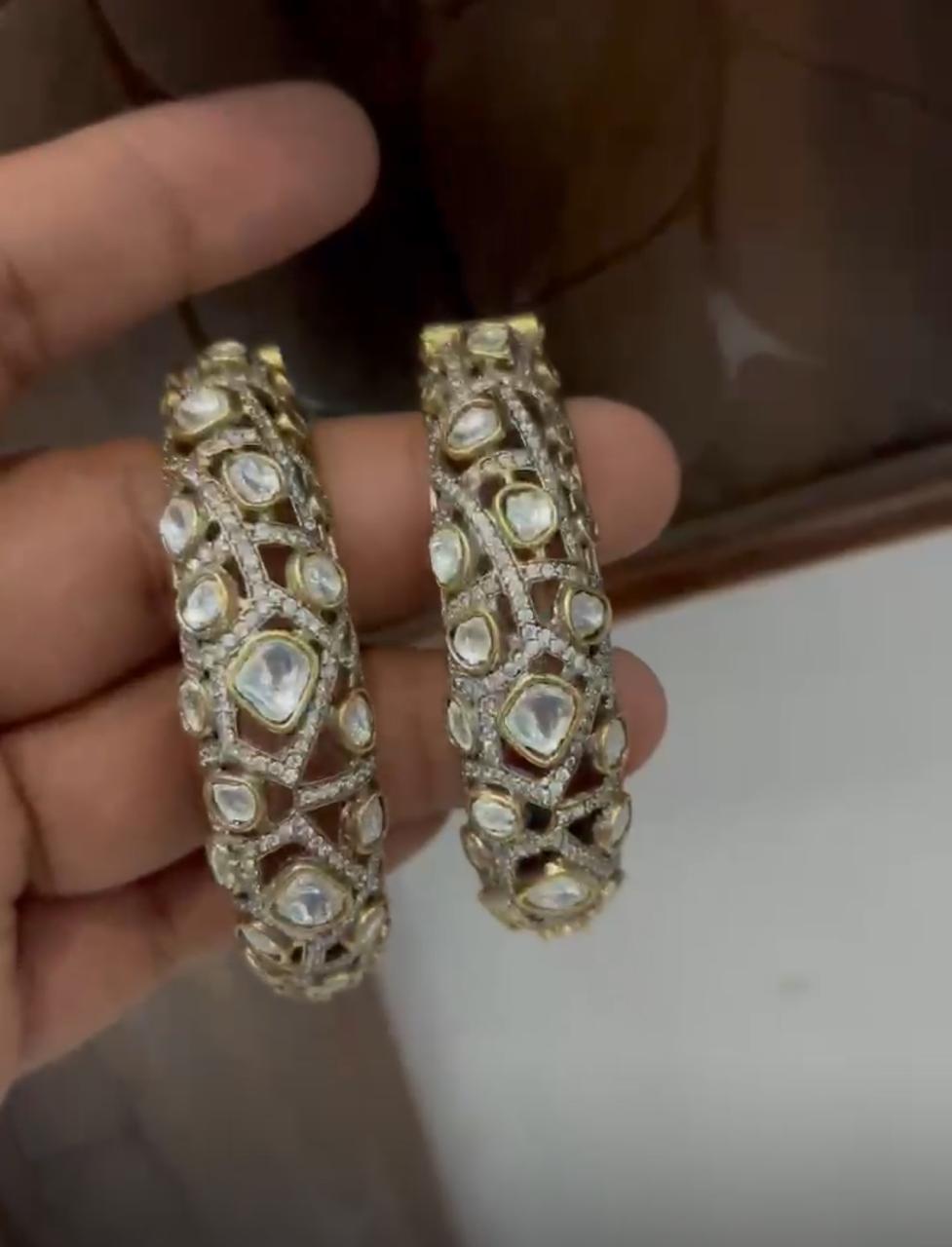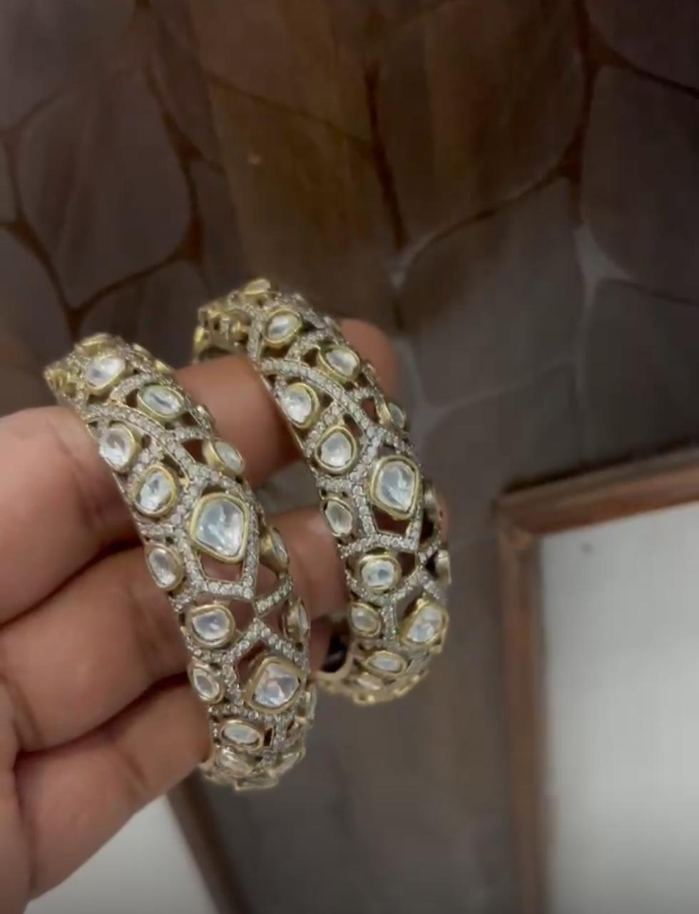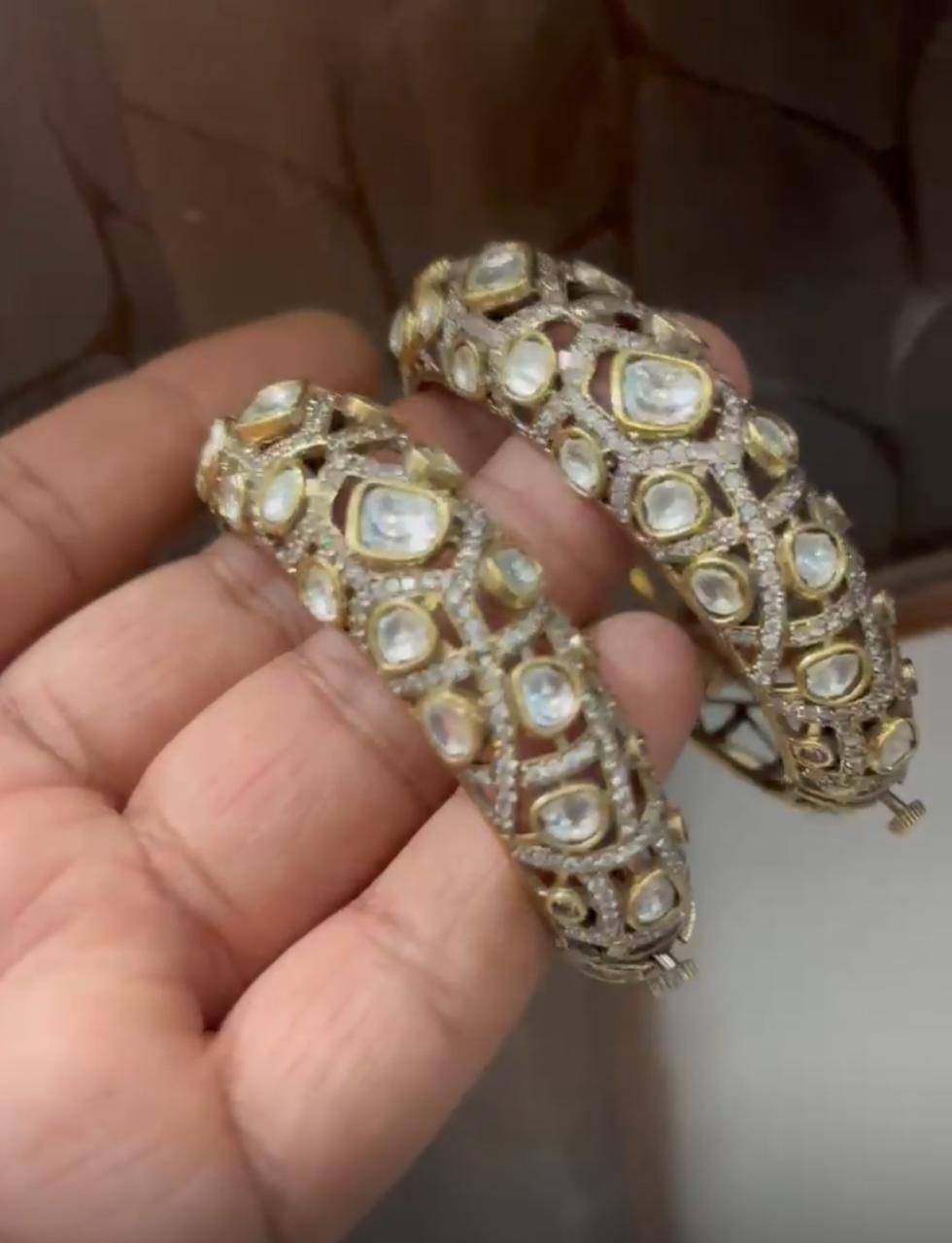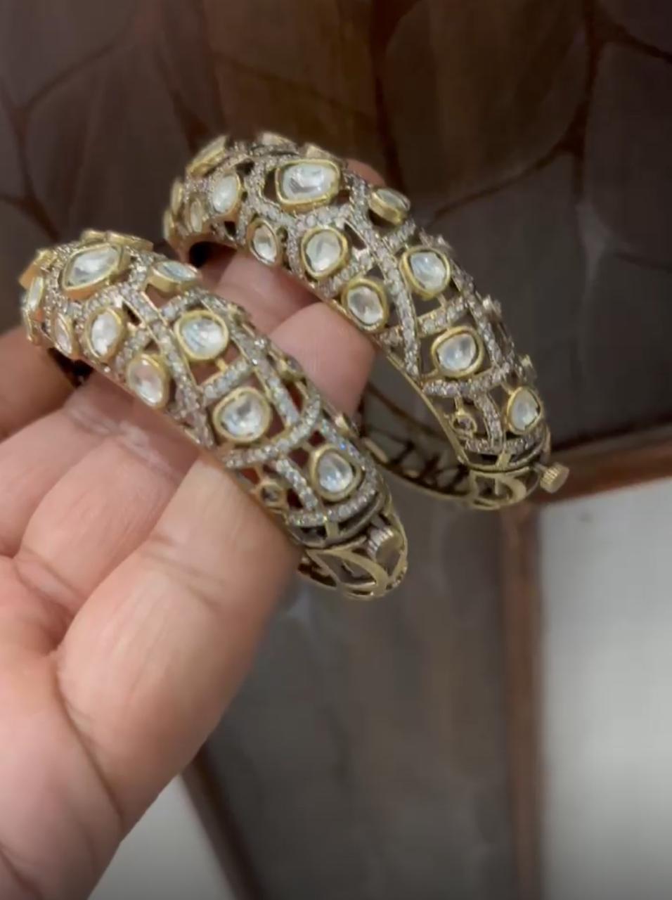 Expertly handcrafted, these bangles showcase an opulent fusion of antique gold finish and uncut Kundan stones, beautifully accented with delicate zircon detailing. The intricate lattice design and symmetrical stone placement create a regal aesthetic, making these bangles a perfect accessory for weddings, festivals, or grand celebrations. Designed to reflect heritage craftsmanship with a modern twist, they offer both luxury and durability.