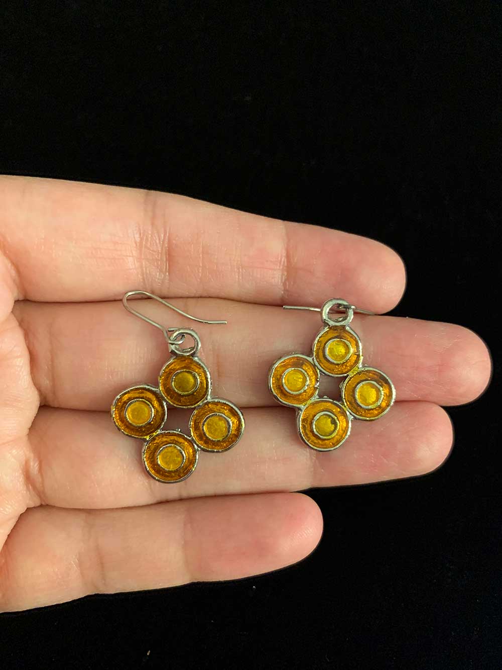 Yellow-centered clover-shaped earrings, framed by metallic rings, radiating charm and simplicity.
