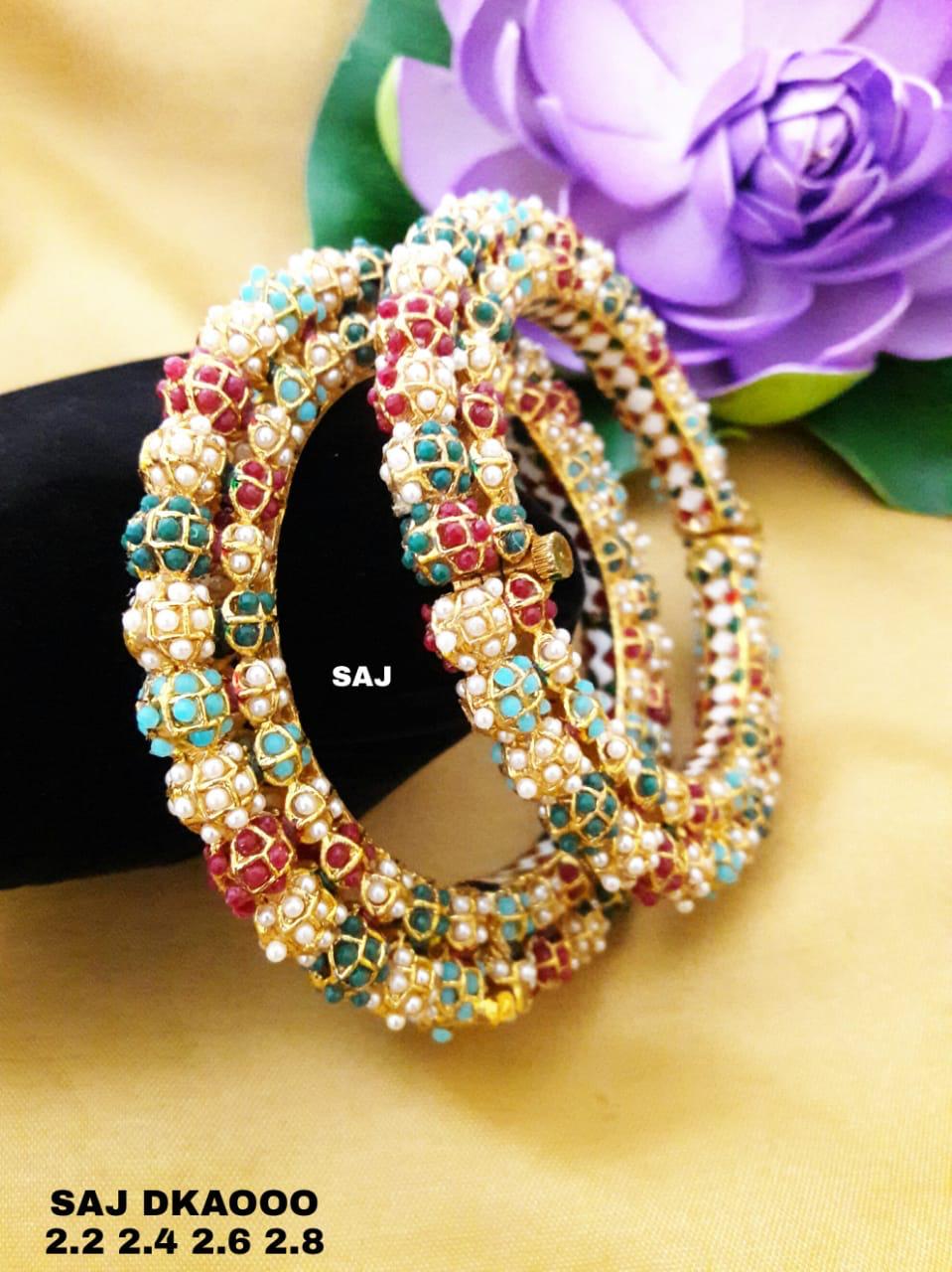 Gold bangles adorned with vibrant red, blue, and white stones, elegantly framed by delicate pearls for timeless sophistication.