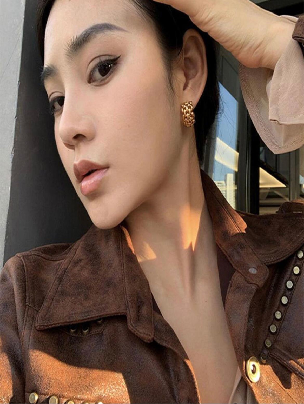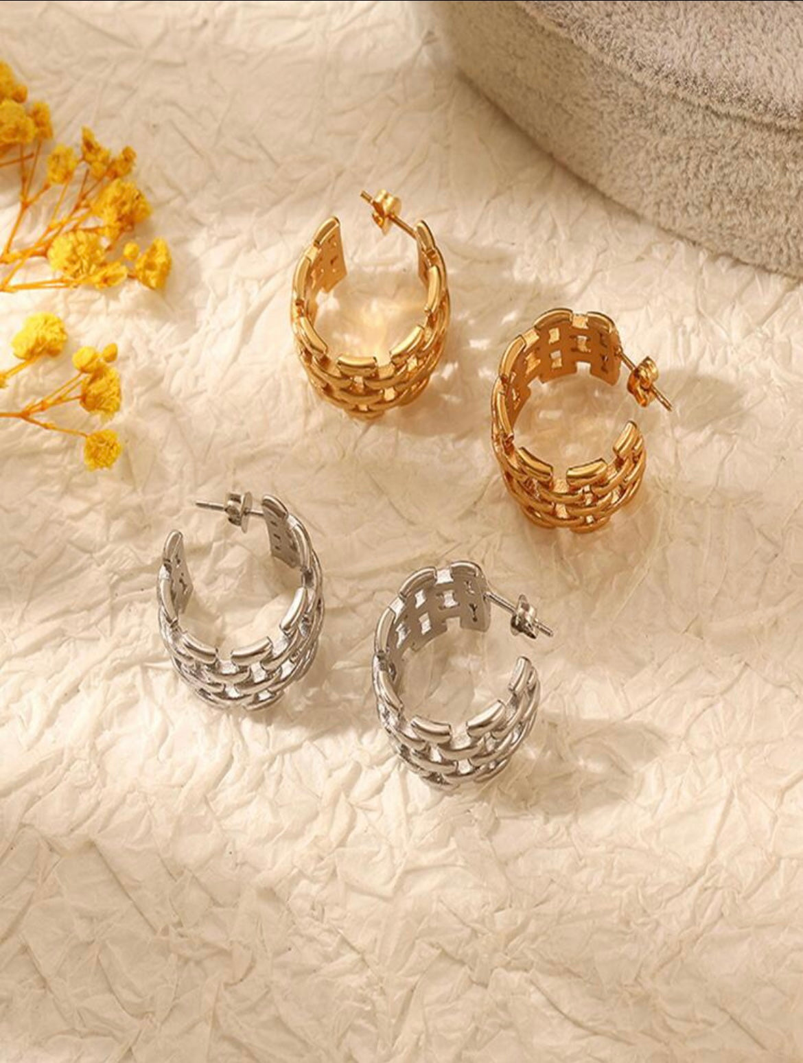 Gold hoop earrings featuring a polished chain-link design, exuding modern elegance with intricate craftsmanship.