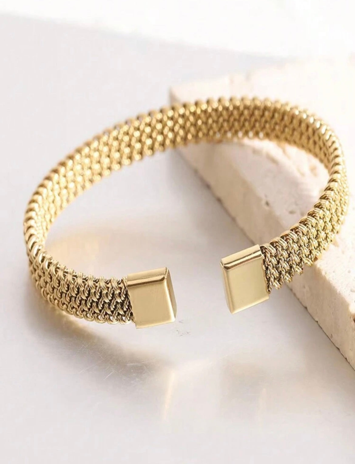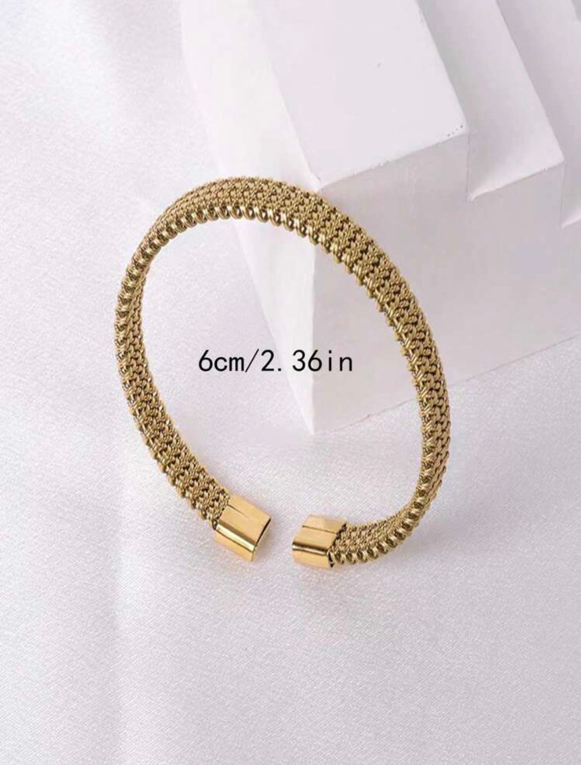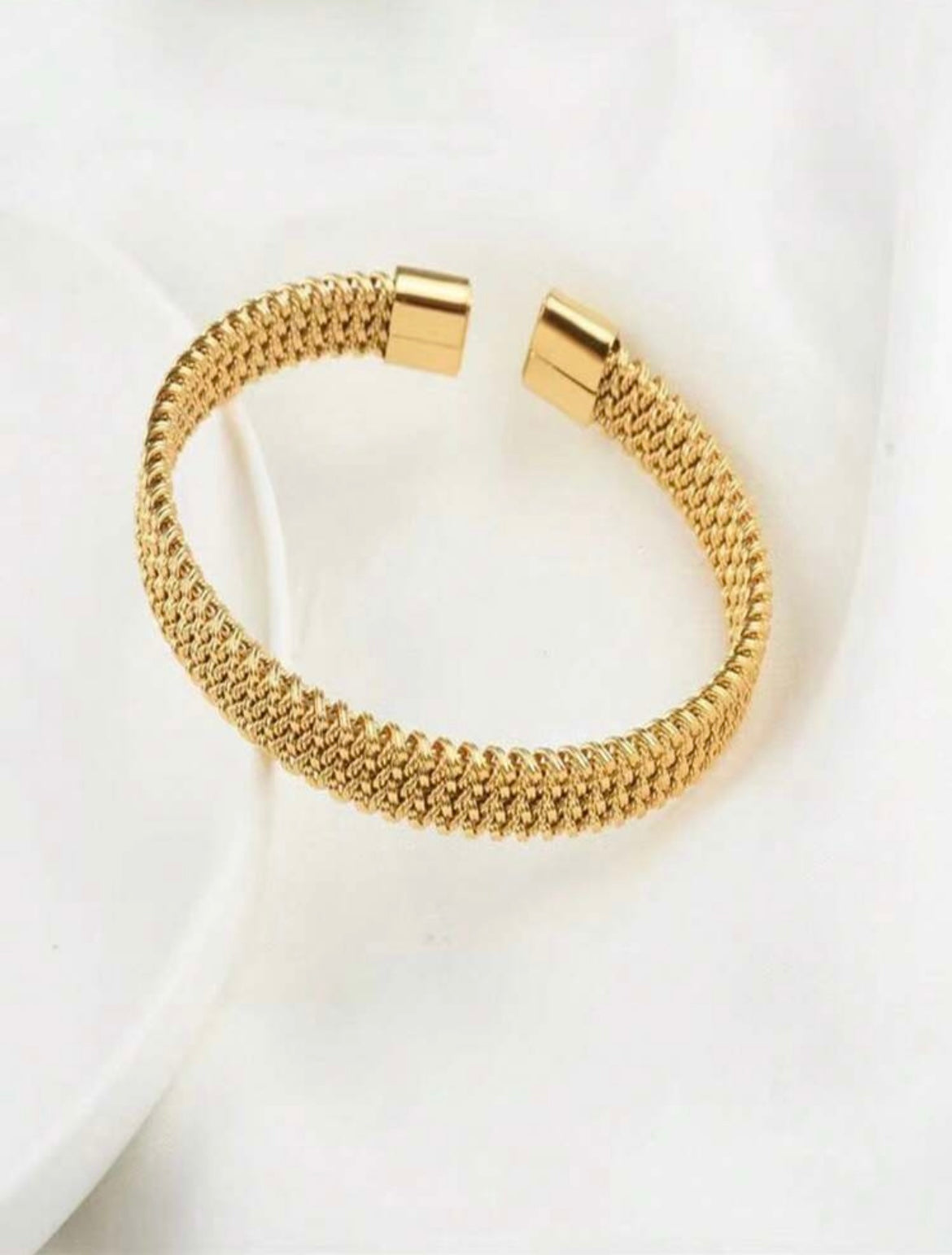 The bracelet is a textured, gold-tone finish, with zigzag pattern, clasp-like design.