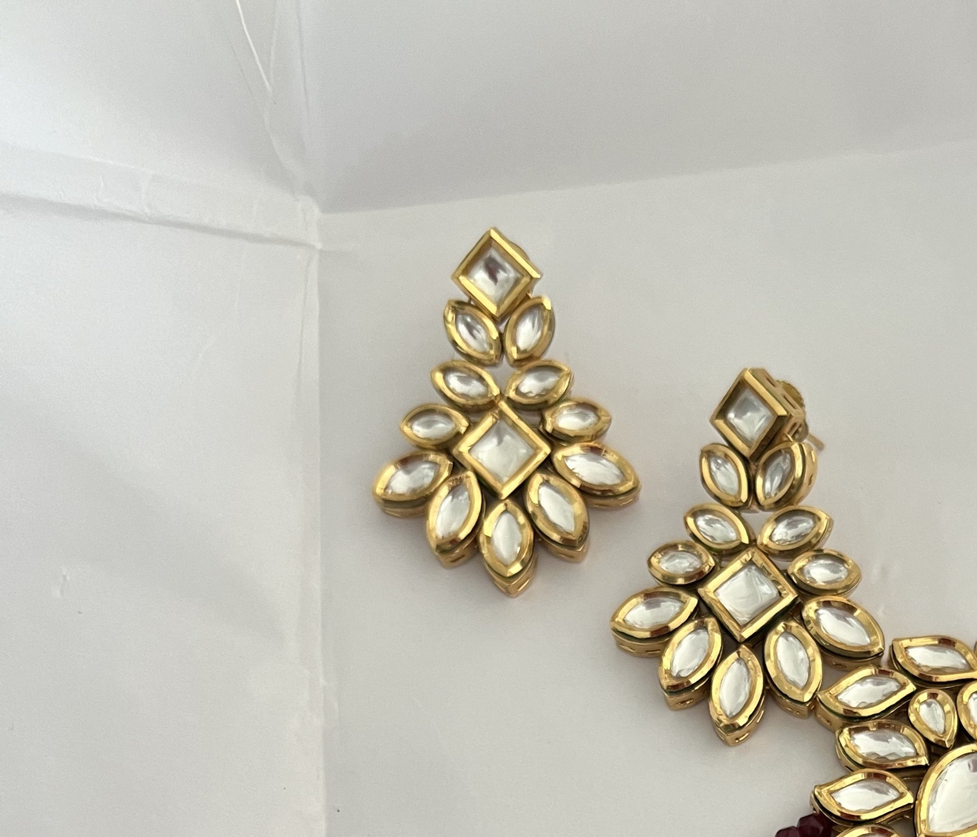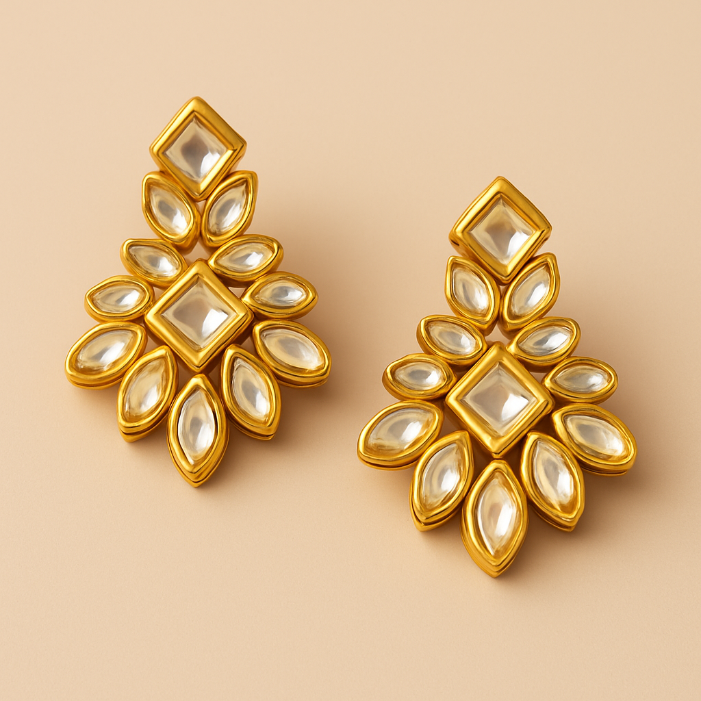 These exquisite kundan earrings showcase a stunning arrangement of hand-set mirror stones in a floral silhouette. Finished in luxe gold plating, they offer the perfect blend of traditional charm and modern sophistication—ideal for both special occasions and refined everyday wear.