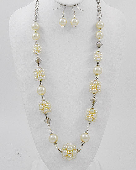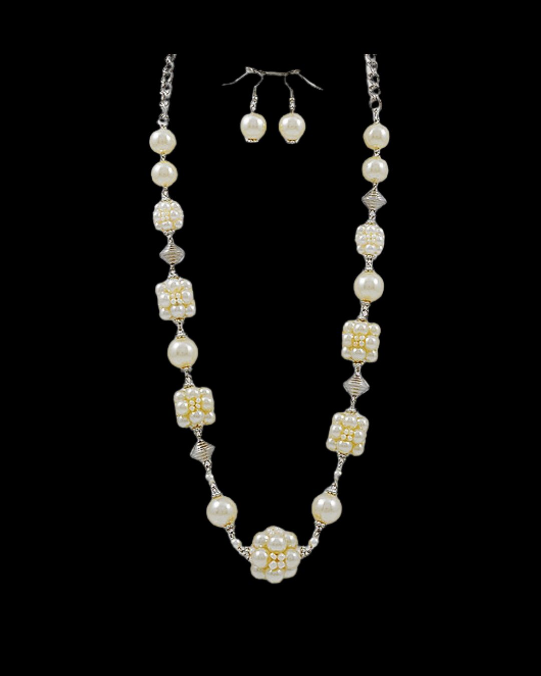 This necklace showcases clusters of lustrous pearls, complemented by silver diamond-shaped spacers for a refined and timeless elegance.