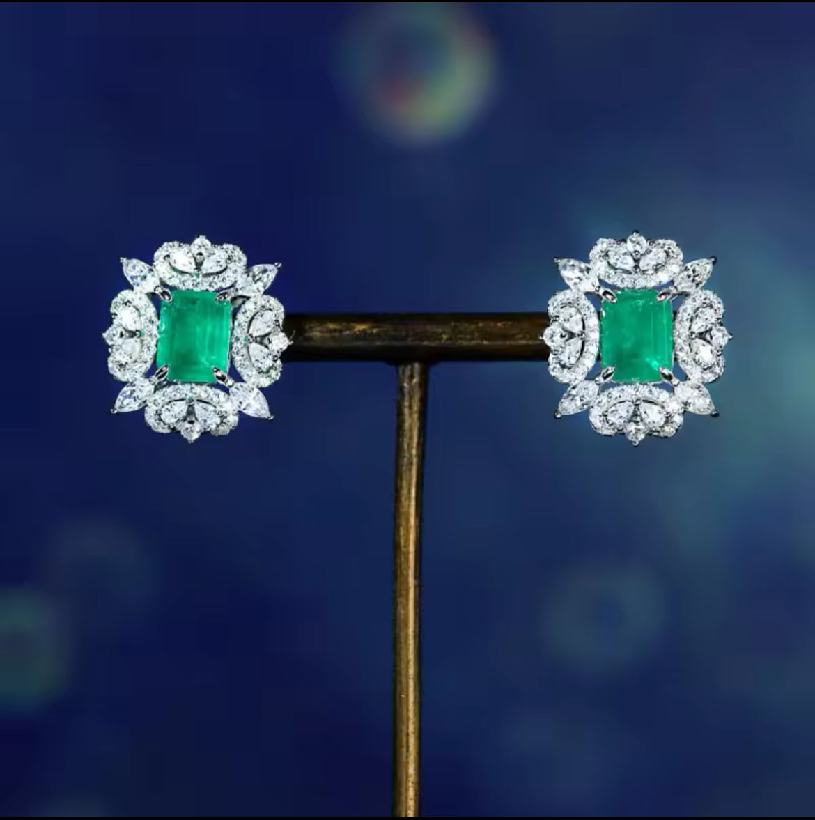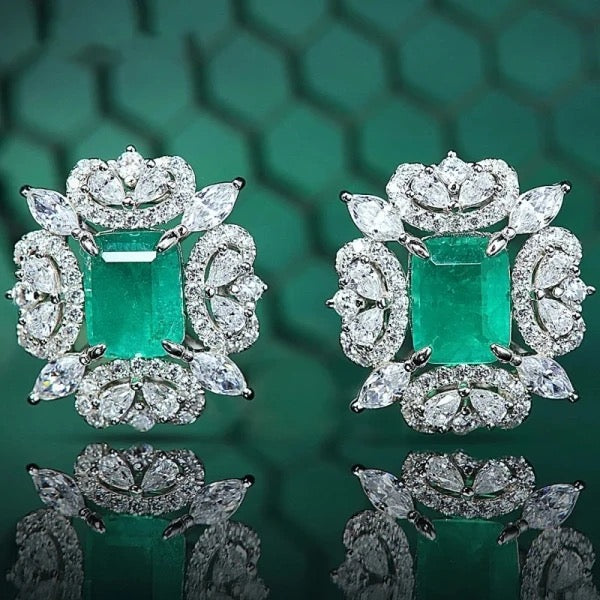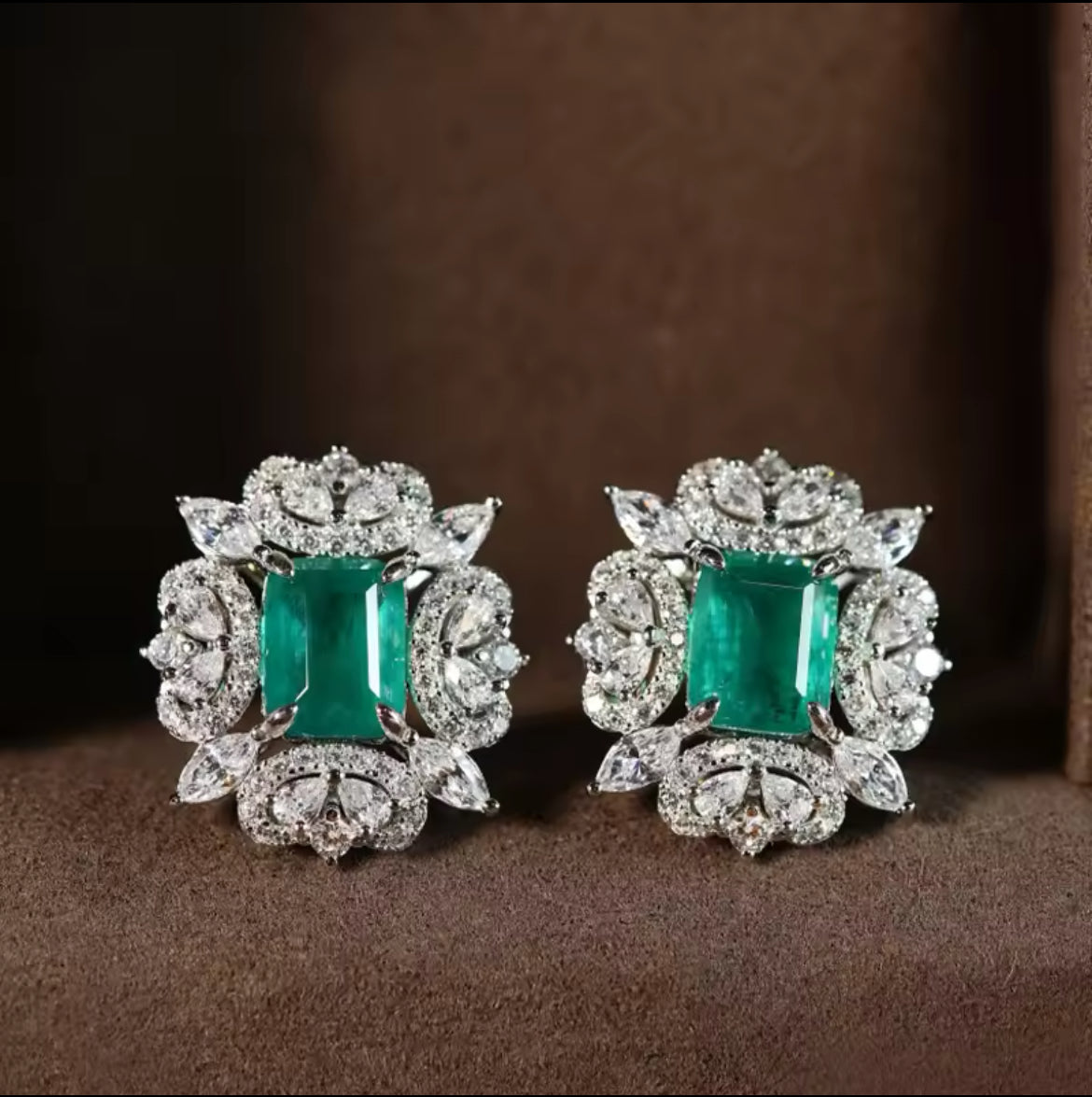 Absolutely stunning!!! The studs are square-shaped with a large emerald-cut green stone, design with intricate detailing.
