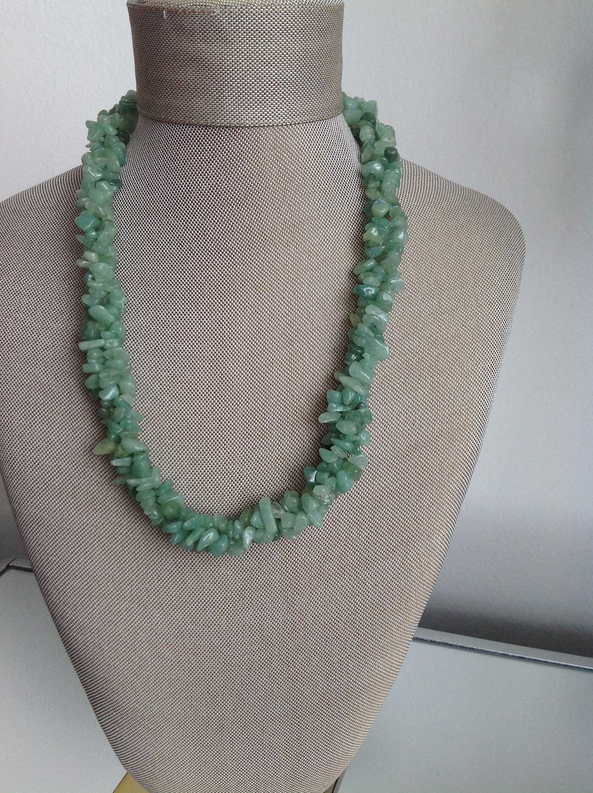 A striking green stone necklace with natural textures, intricately strung to create a bold yet elegant statement piece.