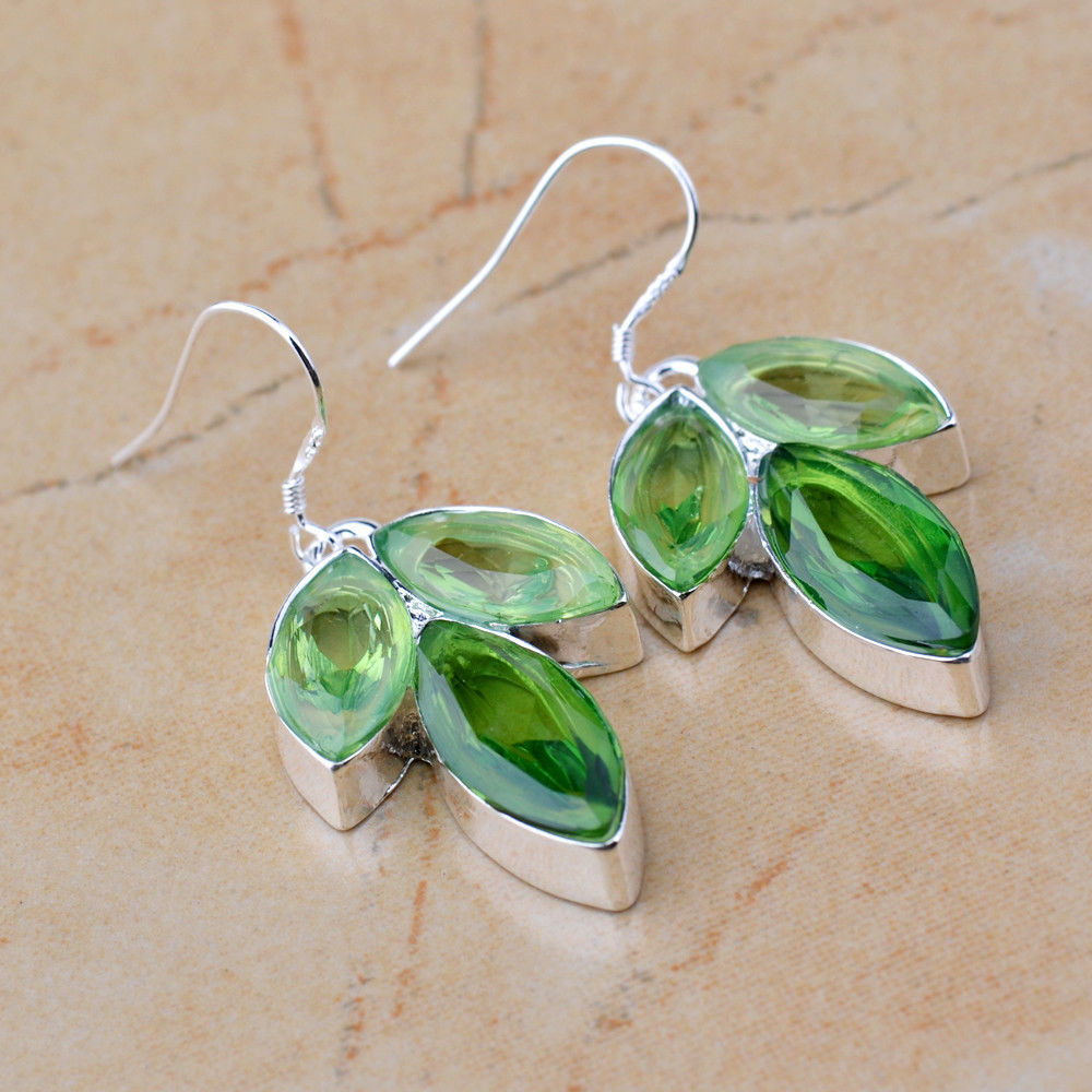 Graceful leaf-inspired design with green marquise gemstones, set in silver for a touch of natural elegance.