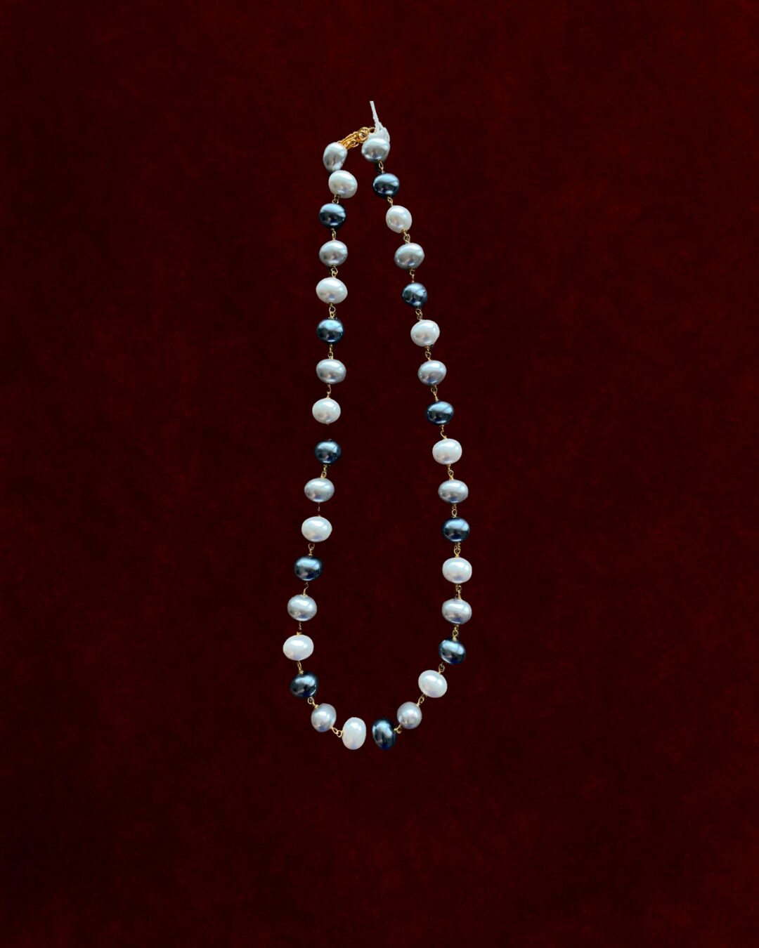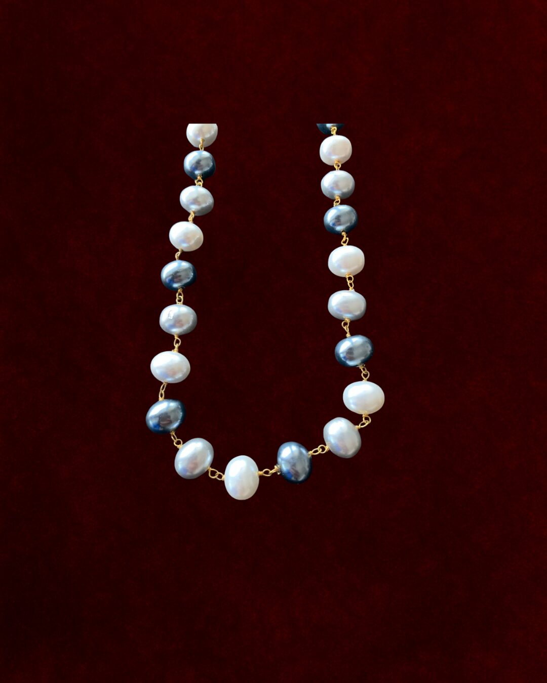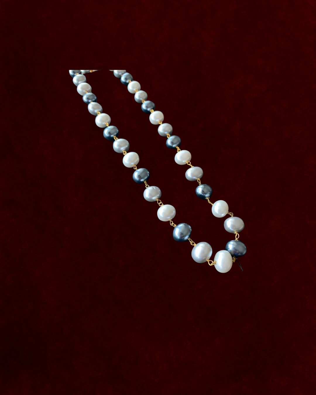 Embodies understated elegance with a modern twist. Featuring alternating white and grey freshwater pearls, each uniquely shaped and connected with delicate gold links, it strikes a harmonious balance between classic beauty and contemporary design. The soft luster of the pearls against the rich backdrop enhances its timeless appeal, making it an ideal accessory for both formal events and everyday sophistication.