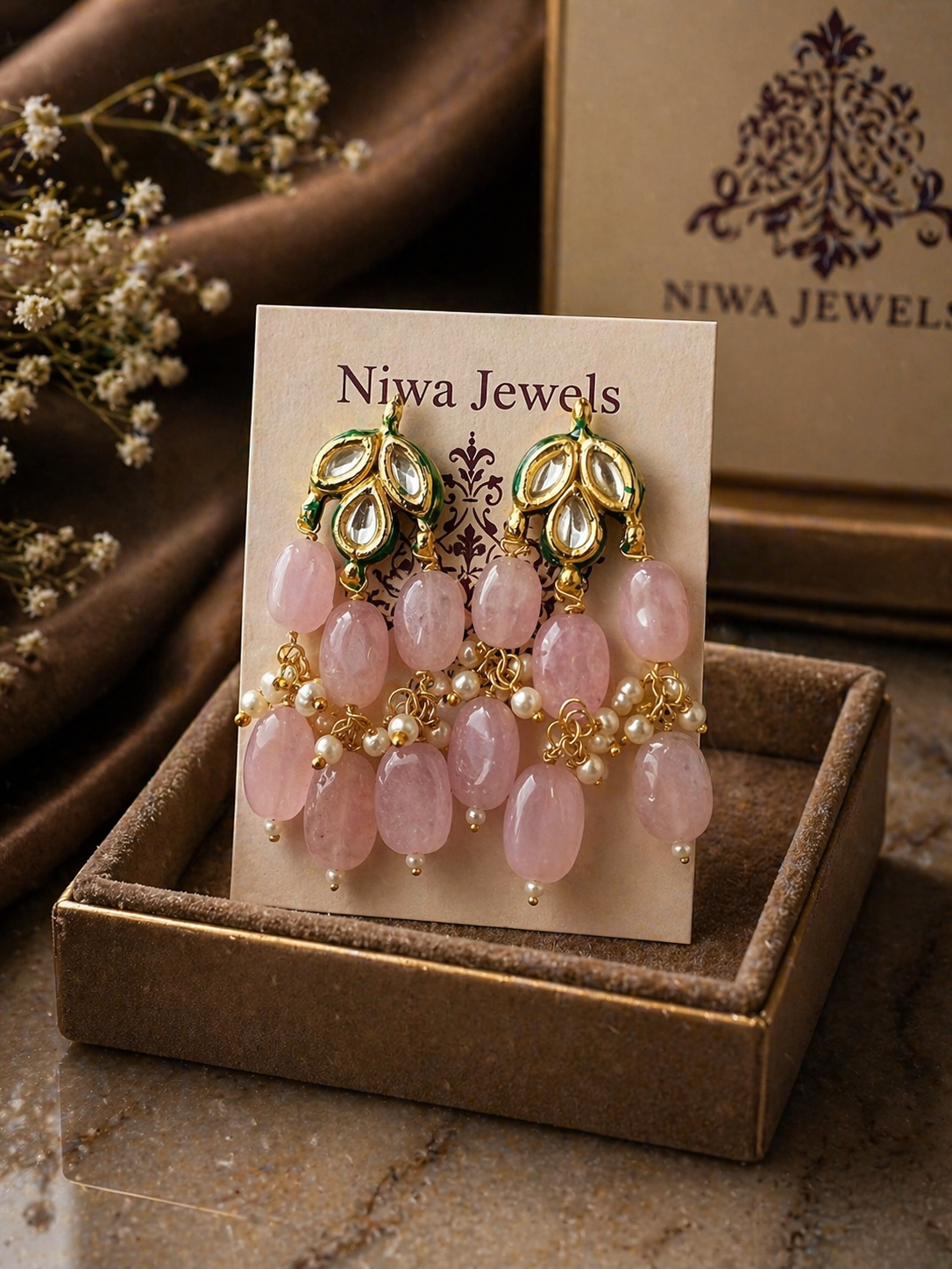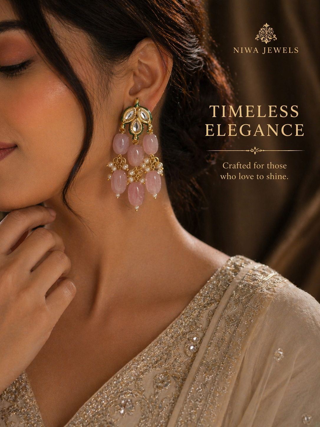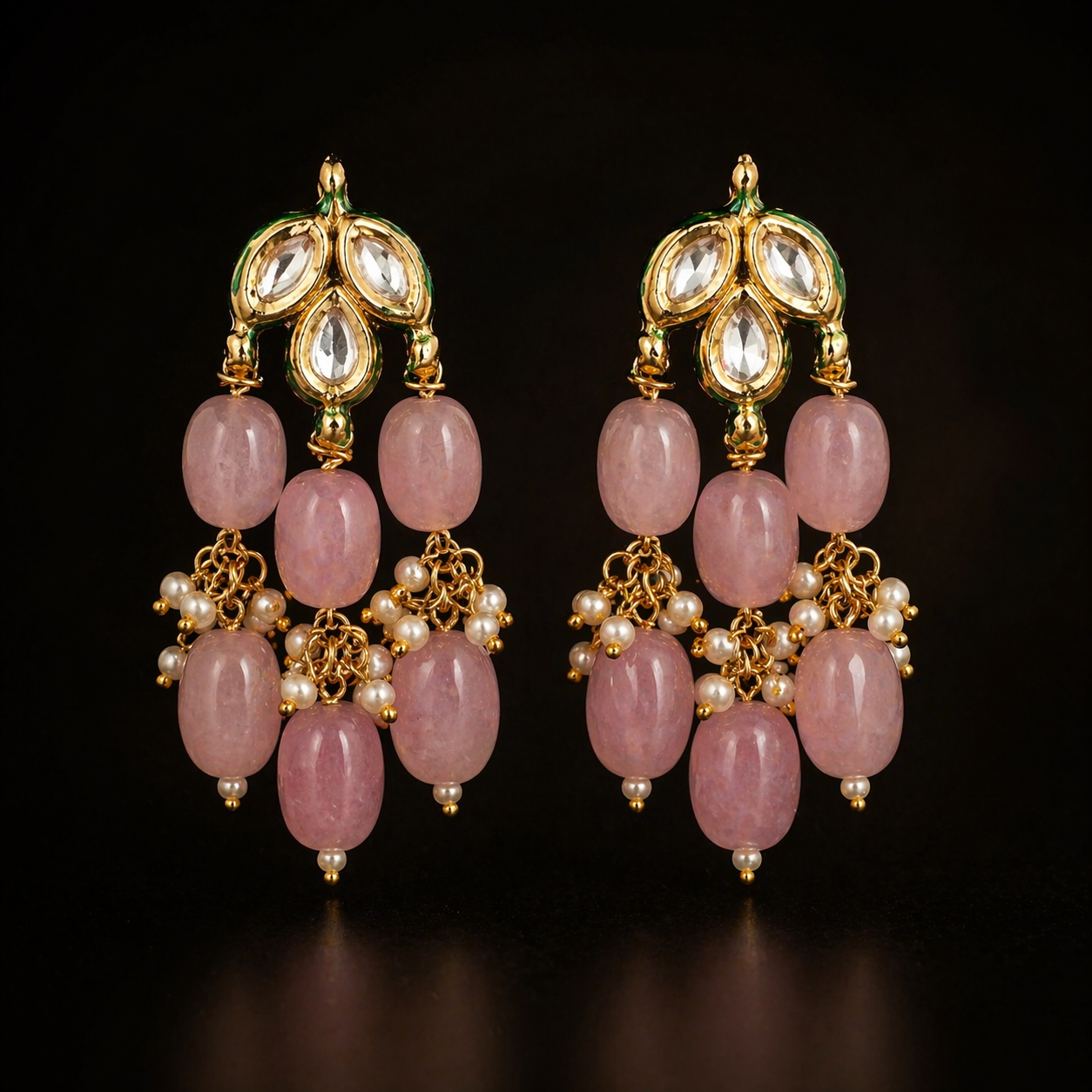 Delicately crafted with soft blush stones and intricate kundan detailing, these statement chandeliers exude timeless elegance. Perfect for weddings and festive occasions, they add a graceful, luxurious touch to any look.