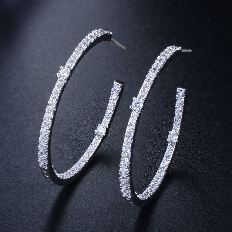 Large hoop earrings encrusted with sparkling stones, arranged to create a dazzling yet refined display of elegance. Ideal for elevating special occasions.
