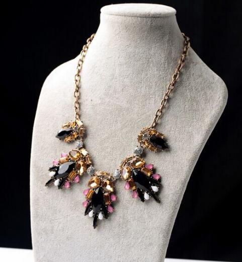 A striking necklace featuring black, pink, and white gemstones set in intricate gold designs-a perfect blend of elegance and artistry.