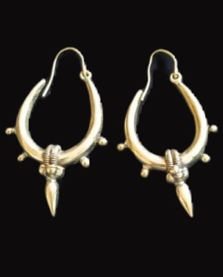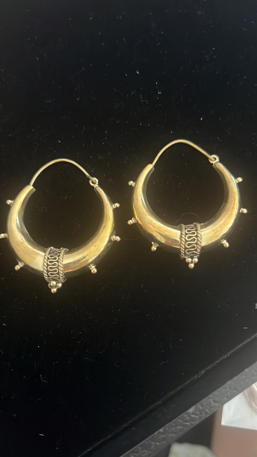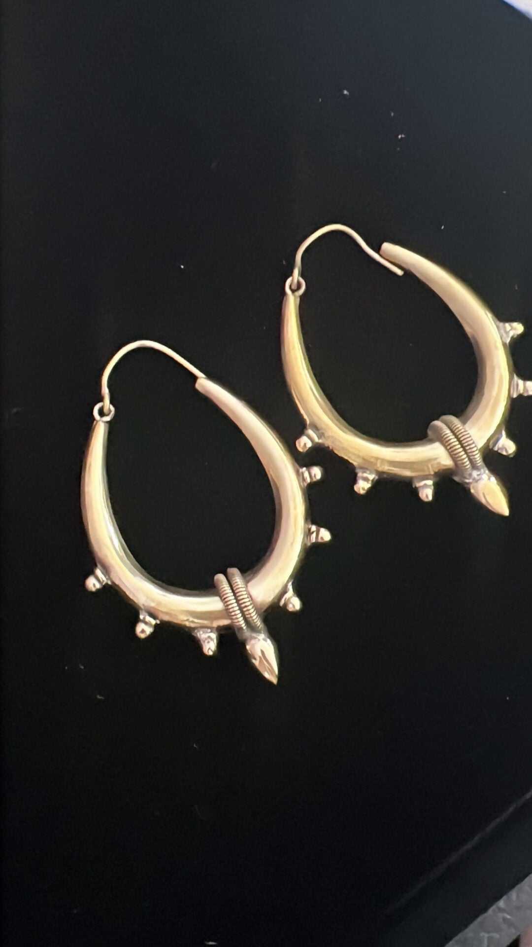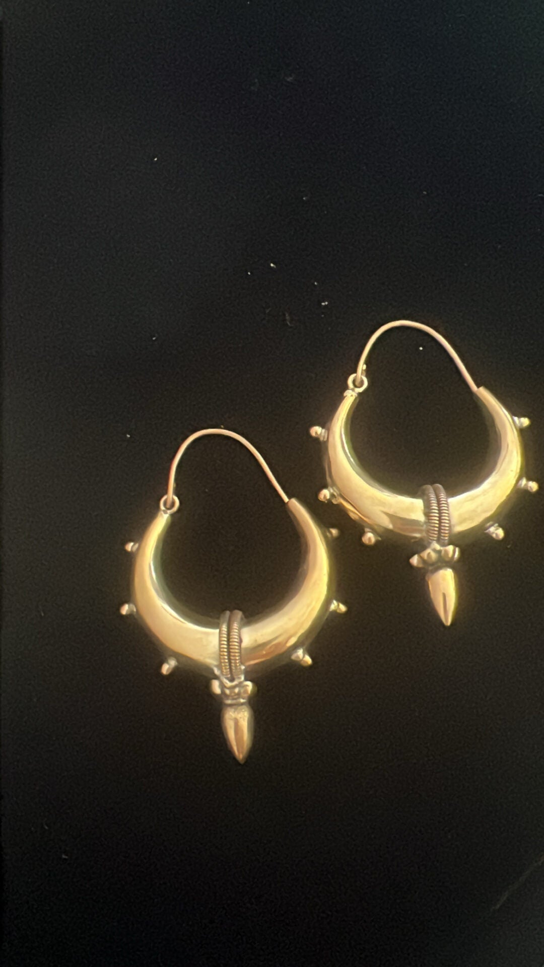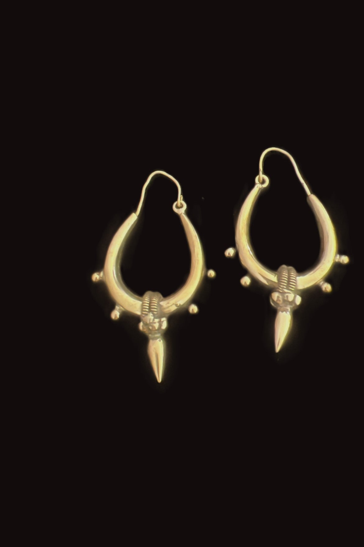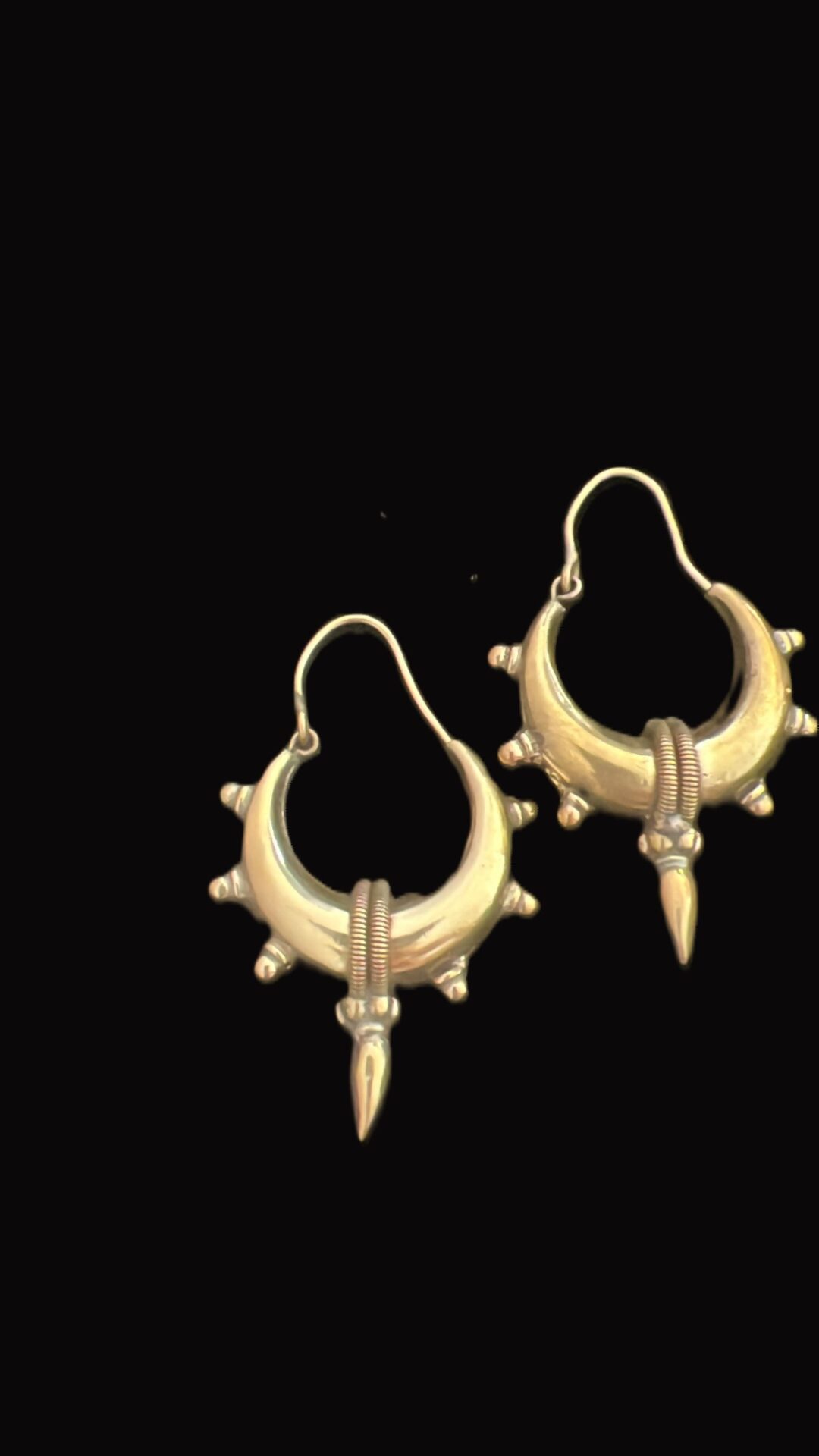 Gold crescent earrings with intricate spherical detailing and elongated drops-ornate and elegant.