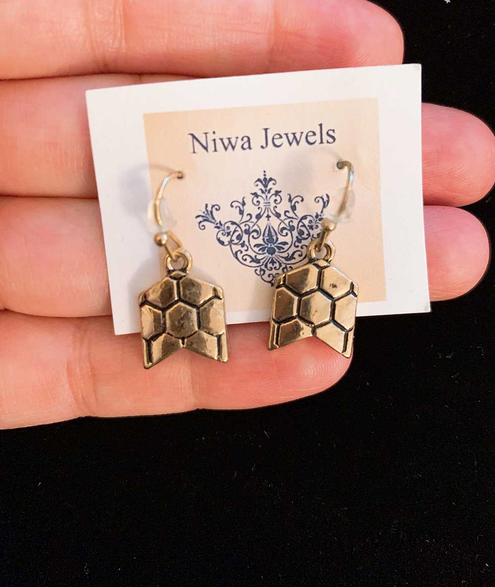 Hexagonal honeycomb-inspired earrings in a golden finish, showcasing intricate craftsmanship and modern elegance.
