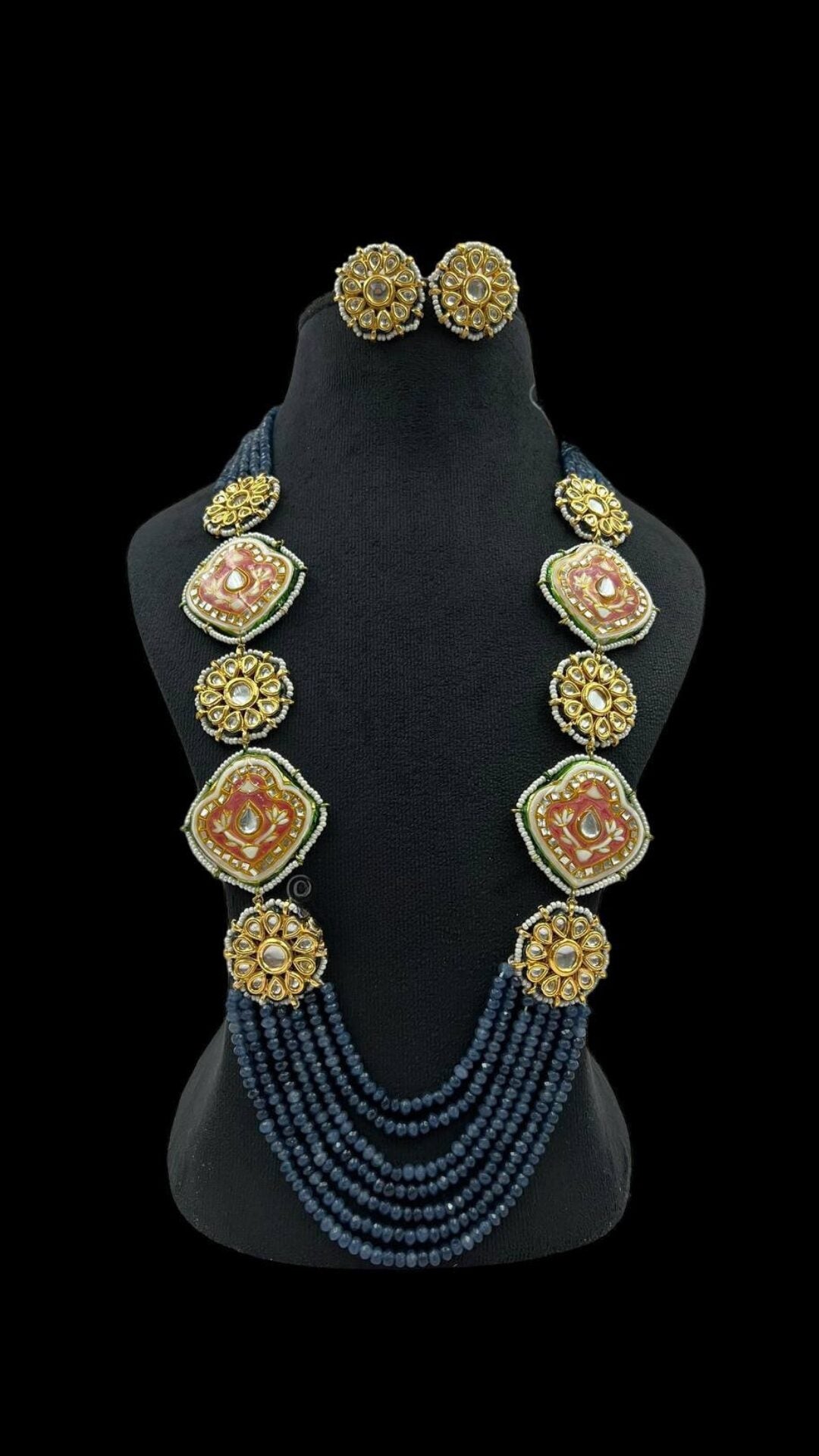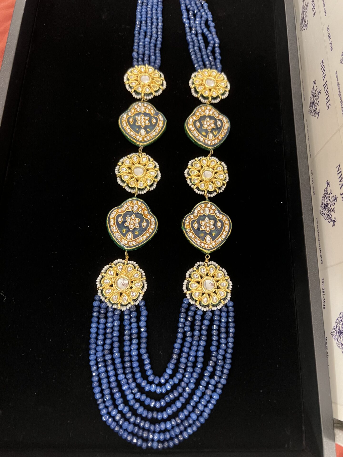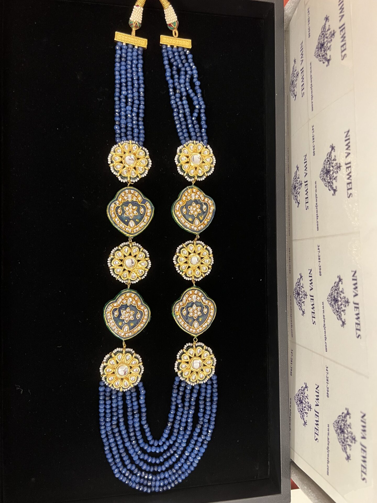 An ornate necklace of blue bead strands, accented with gold floral designs and pearls-elegantly handcrafted for timeless charm.