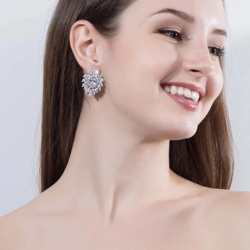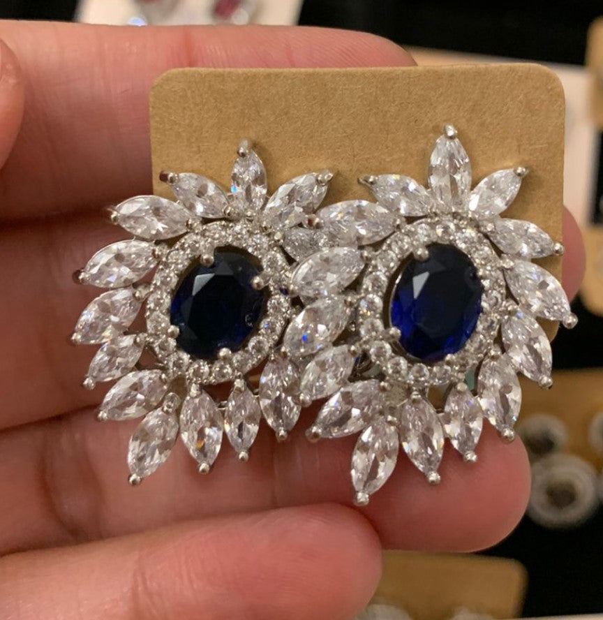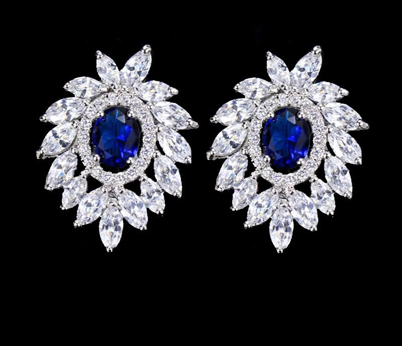 Floral earrings with a vivid blue gemstone, framed by sparkling marquise stones-elegant and timeless.