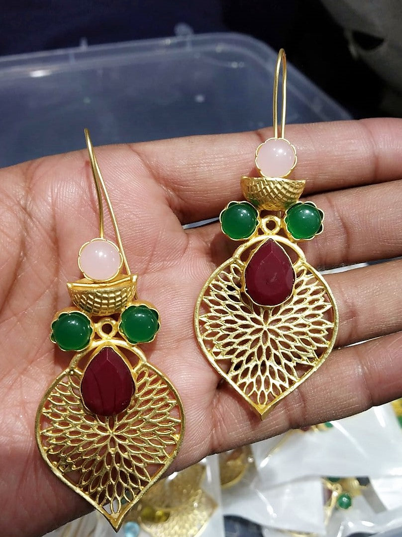 Graceful teardrop earrings featuring intricate gold filigree, accented with a vibrant red gemstone and delicate green and pink stones for timeless charm.