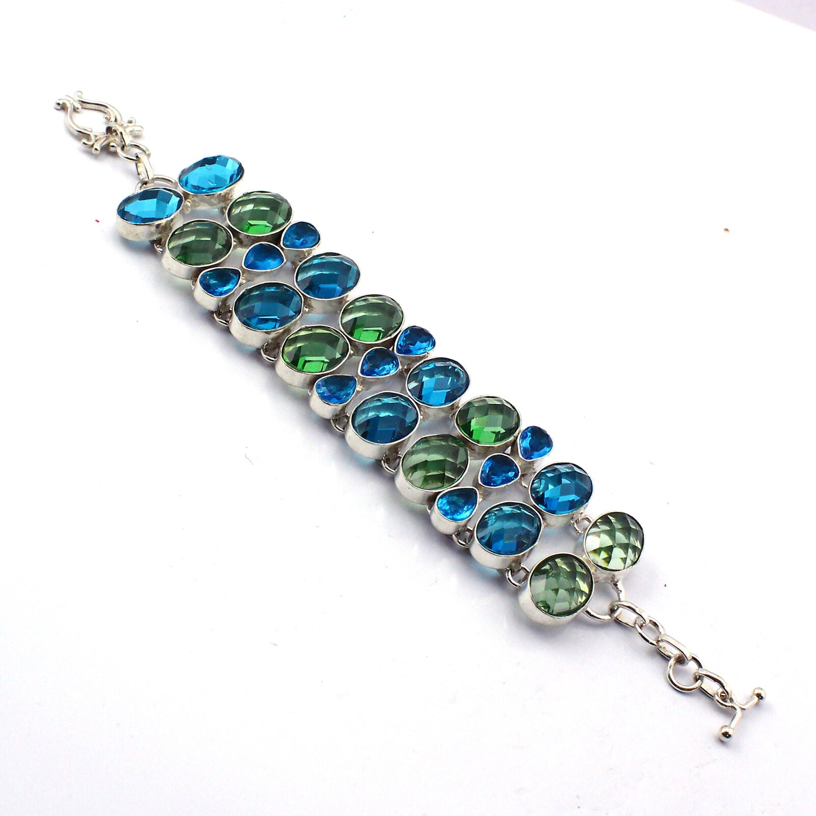 Set in sterling silver, a vibrant bracelet featuring alternating rows of oval blue and green gemstones set in silver-tone bezels, offering a sparkling and colorful design.
