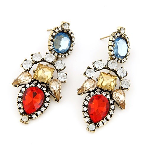 A captivating design featuring vibrant gemstones-blue, yellow, beige, and red-gracefully arranged and framed by sparkling clear stones for timeless elegance.
