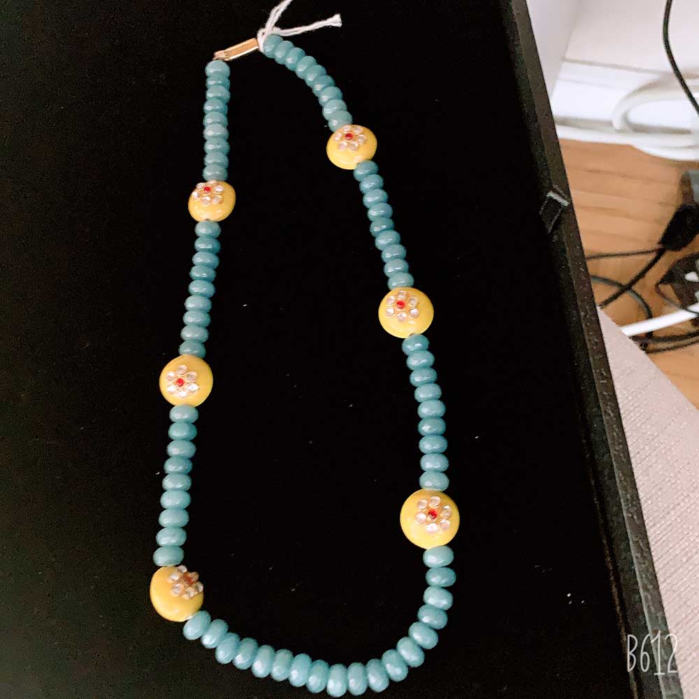 A vibrant turquoise bead necklace accented by golden floral designs with red and white details, blending playful charm with refined artistry.