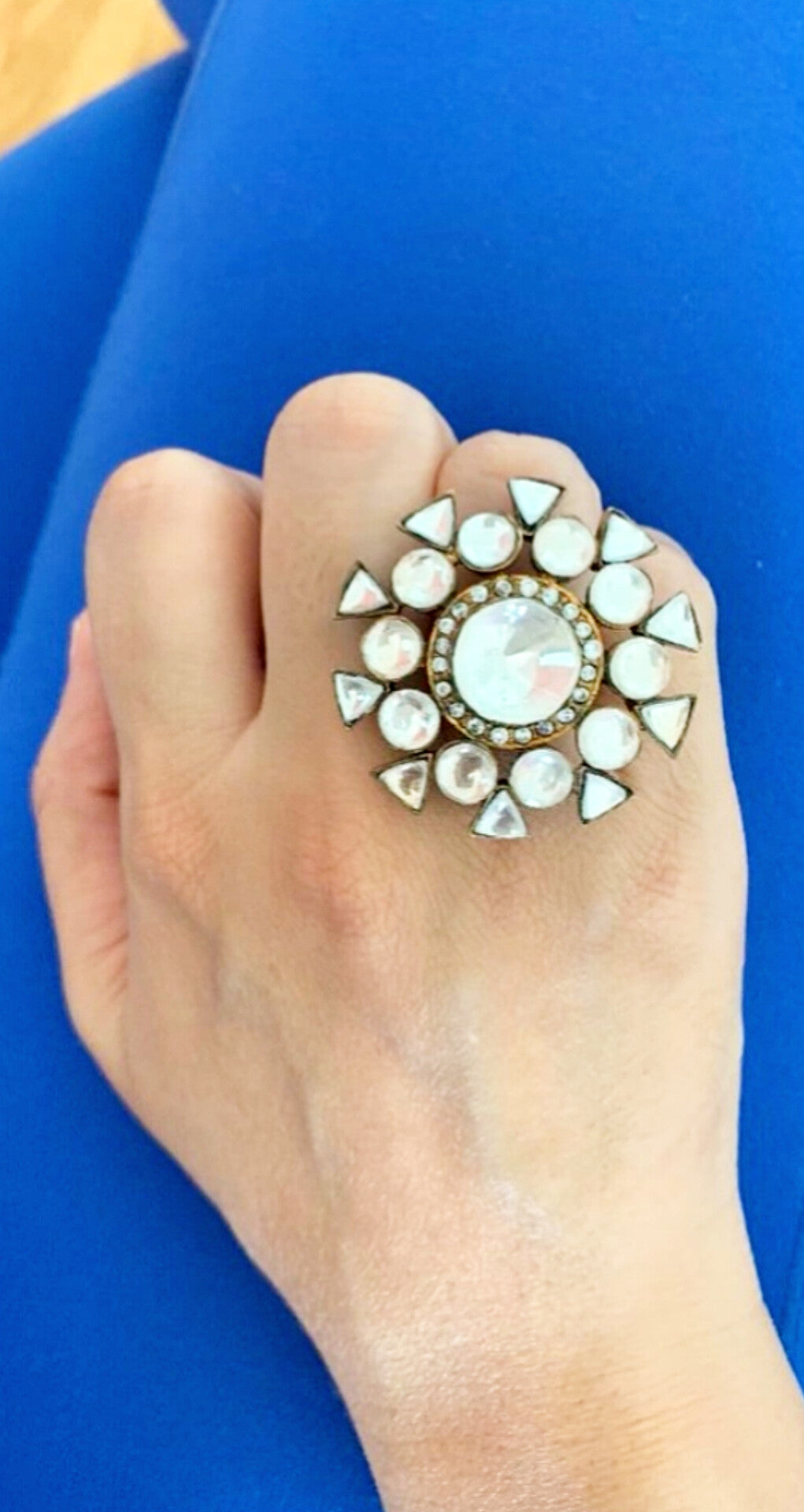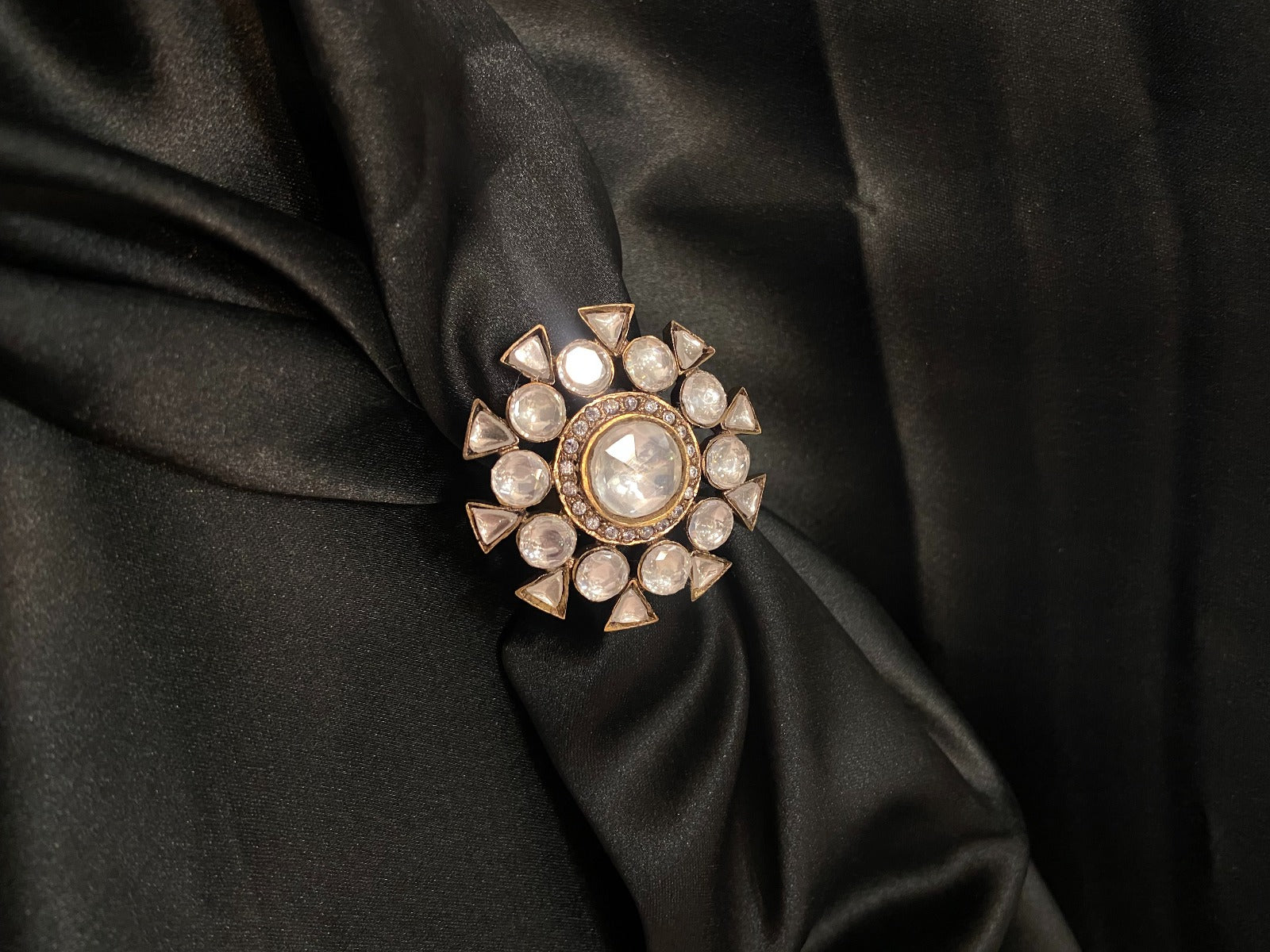 Make a bold statement with this stunning Ring, featuring radiant Kundan stones in a floral burst design. Perfect for festive occasions or adding sparkle to any outfit.