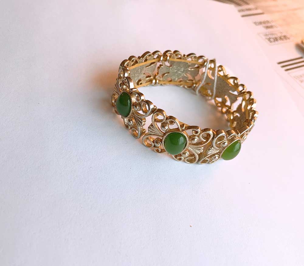 A gold bracelet with intricate filigree detailing and polished green stones, exuding vintage charm and elegance.