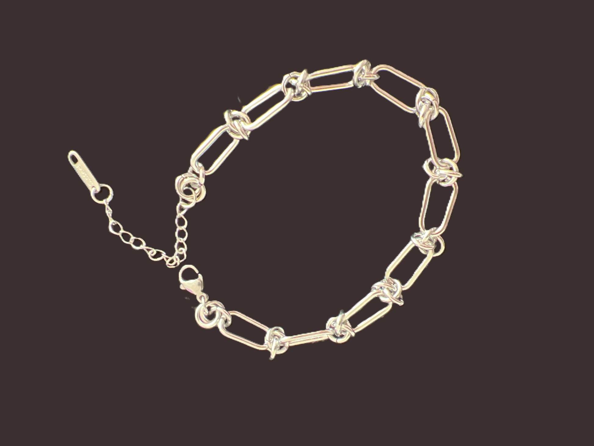 A sleek twist on the classic paperclip chain, this silver-tone bracelet features elongated links accented with delicate knot details. Adjustable for the perfect fit, it adds a modern, minimalist edge to any look.