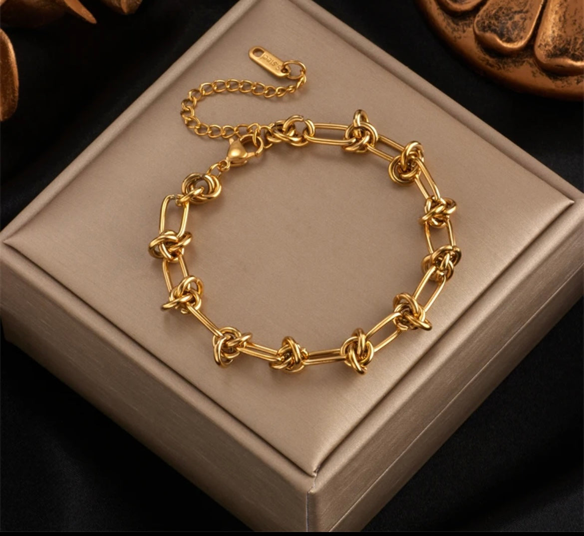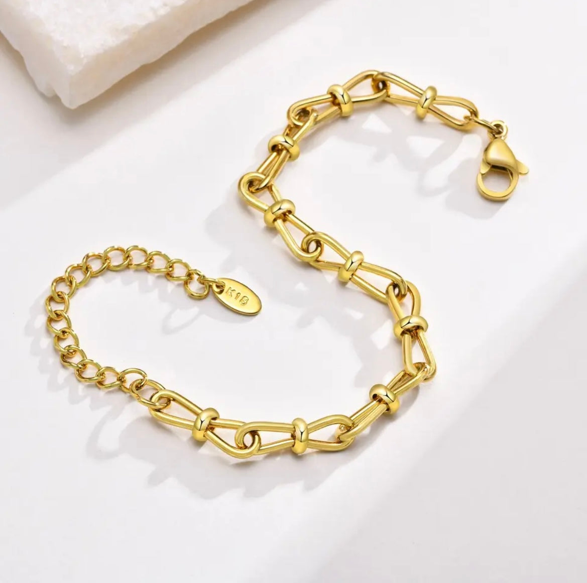 The bracelet is a chain-link style with a series of knot-shaped links.