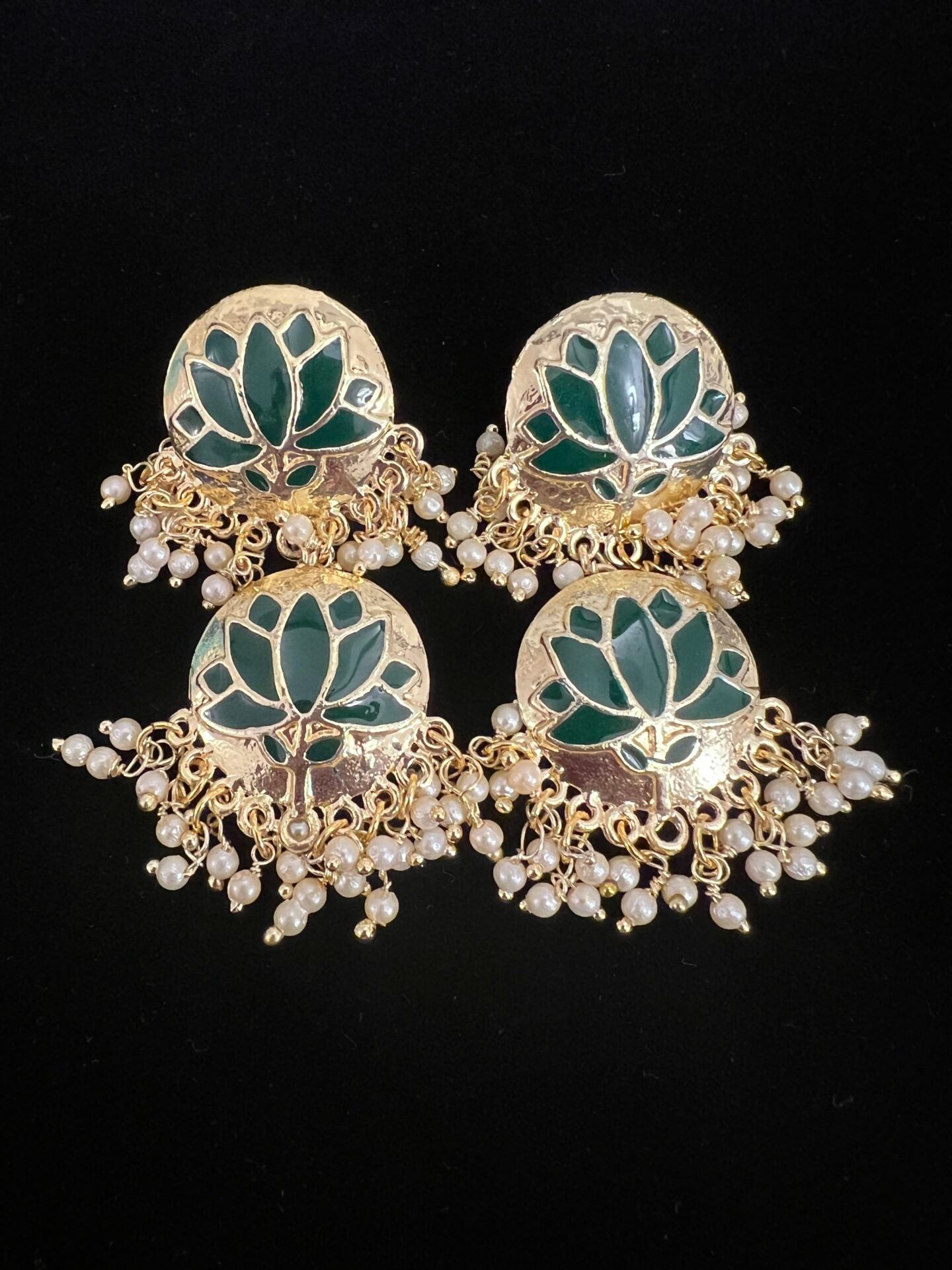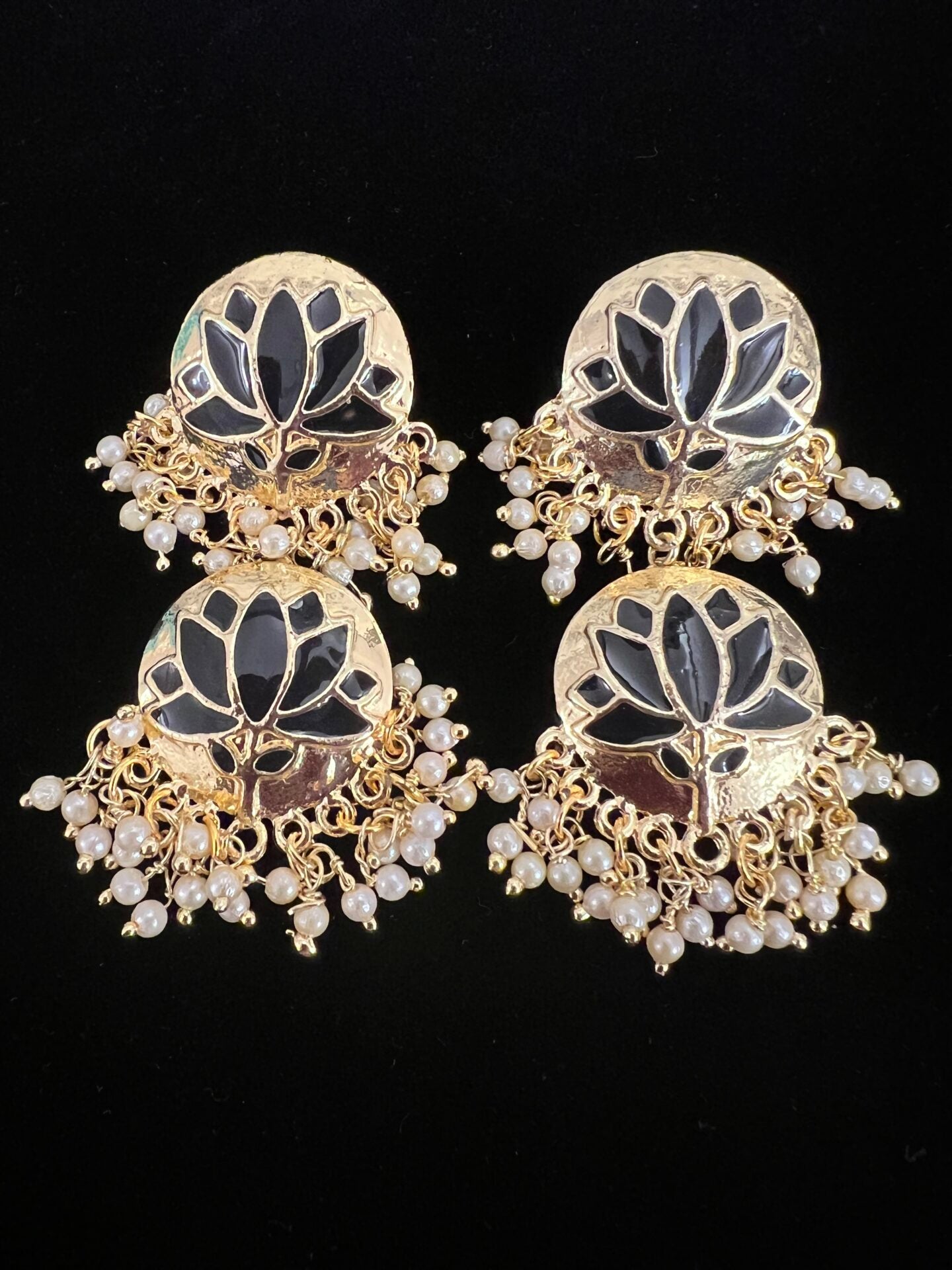 Delicate earrings with a gold base featuring blue lotus motifs, adorned with graceful pearl fringe for a refined traditional allure.