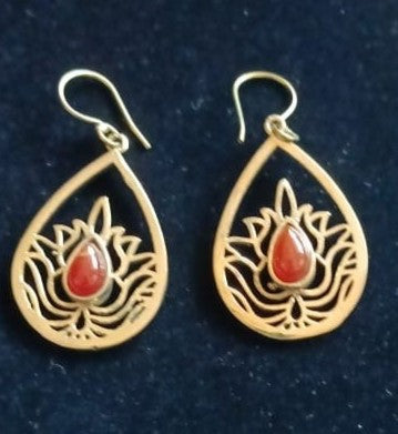 Delicately handcrafted, these earrings feature an intricate lotus motif in gold, centered with a deep red stone. A perfect blend of elegance and timeless beauty.