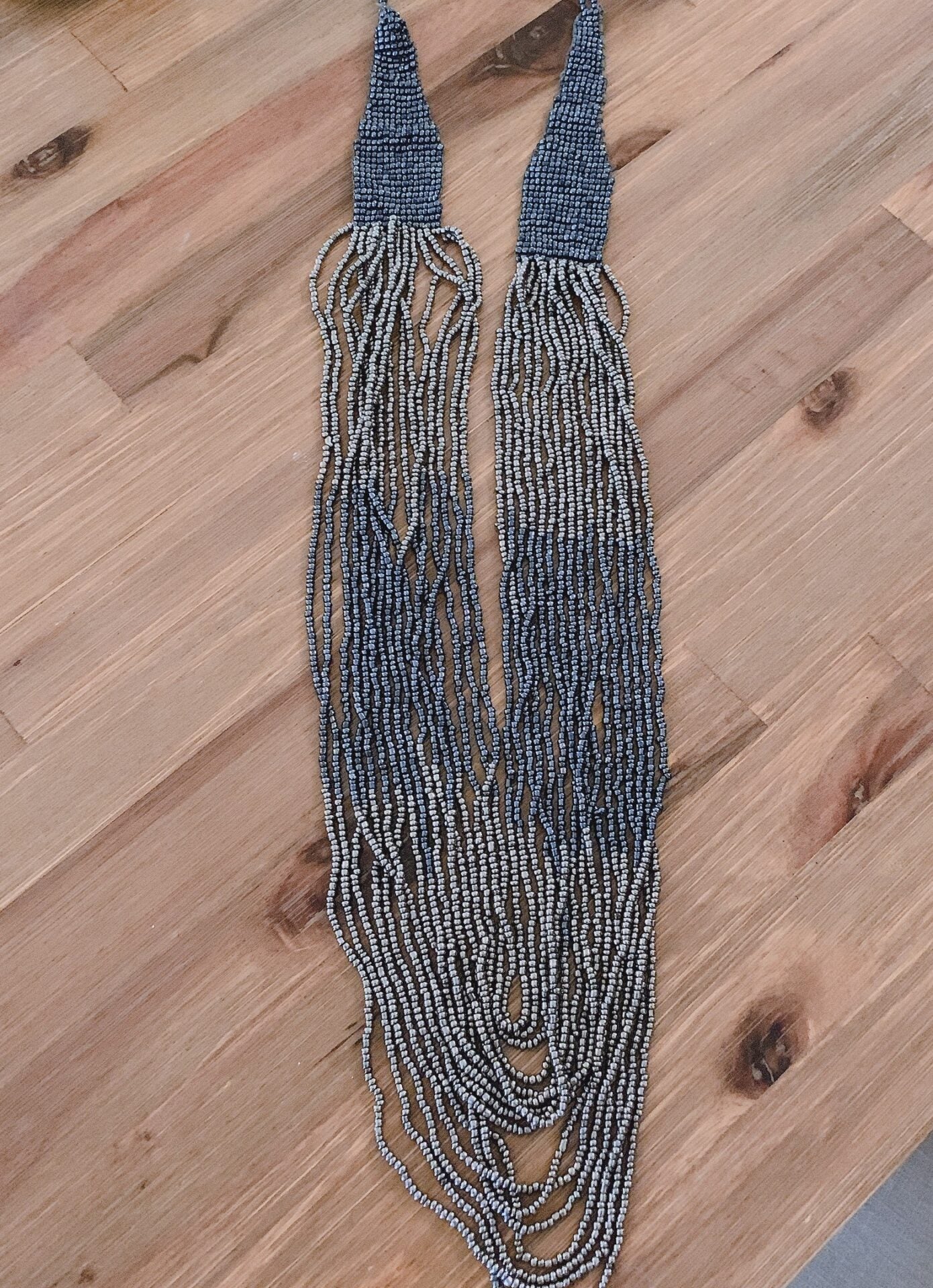 Long drop earrings featuring intricate beaded designs in dark blue and silver tones, showcasing a triangular top and elegant dangling strands. They embody graceful craftsmanship and timeless appeal.