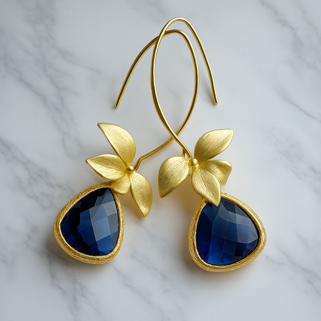 Gold floral earrings with textured petals, accented by teardrop-shaped blue gemstones-elegant and striking.