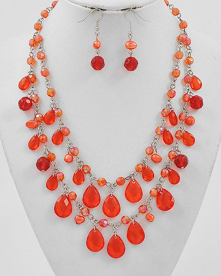 A vibrant jewelry set featuring a cascading necklace and earrings, adorned with orange beads . A perfect blend of vibrancy and elegance, radiating timeless beauty