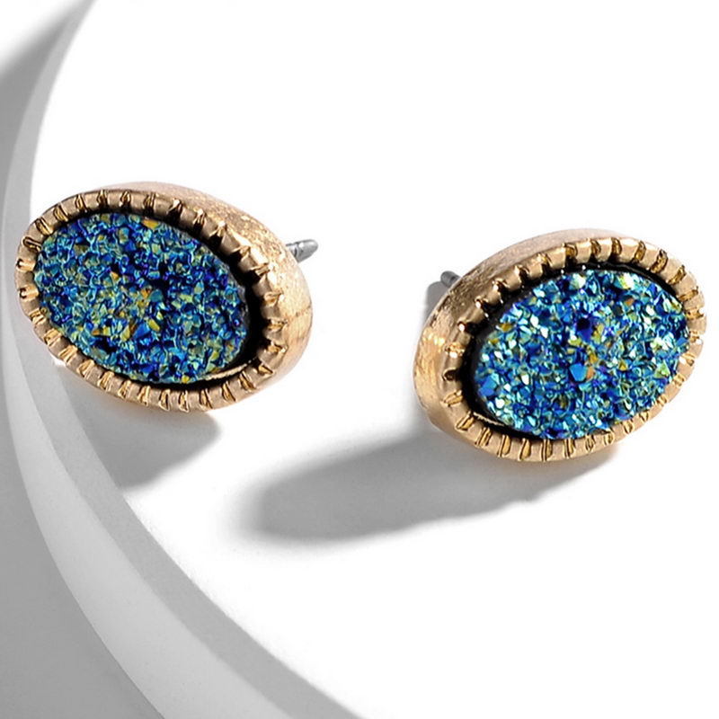 Stud earrings featuring glittery blue stones set in a ridged gold frame-simple yet stunning.