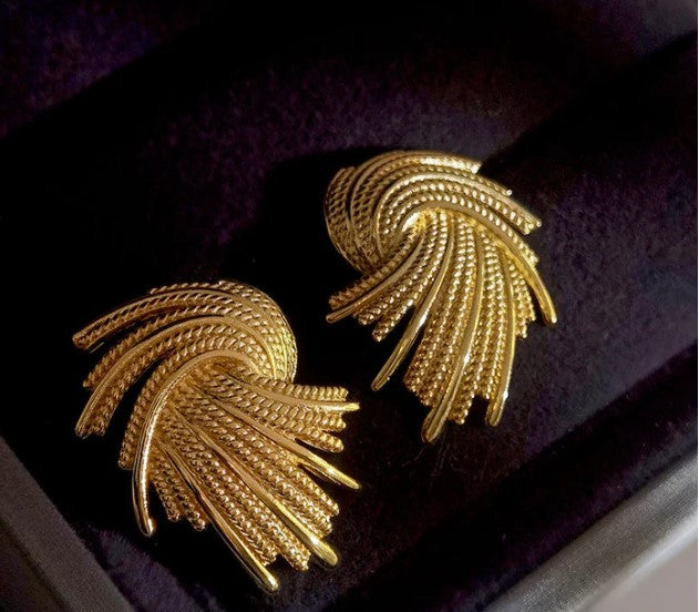The earrings are gold-toned earrings, featuring a retro, ray-shaped design, luxurious appearance.