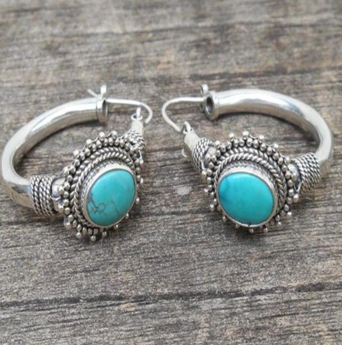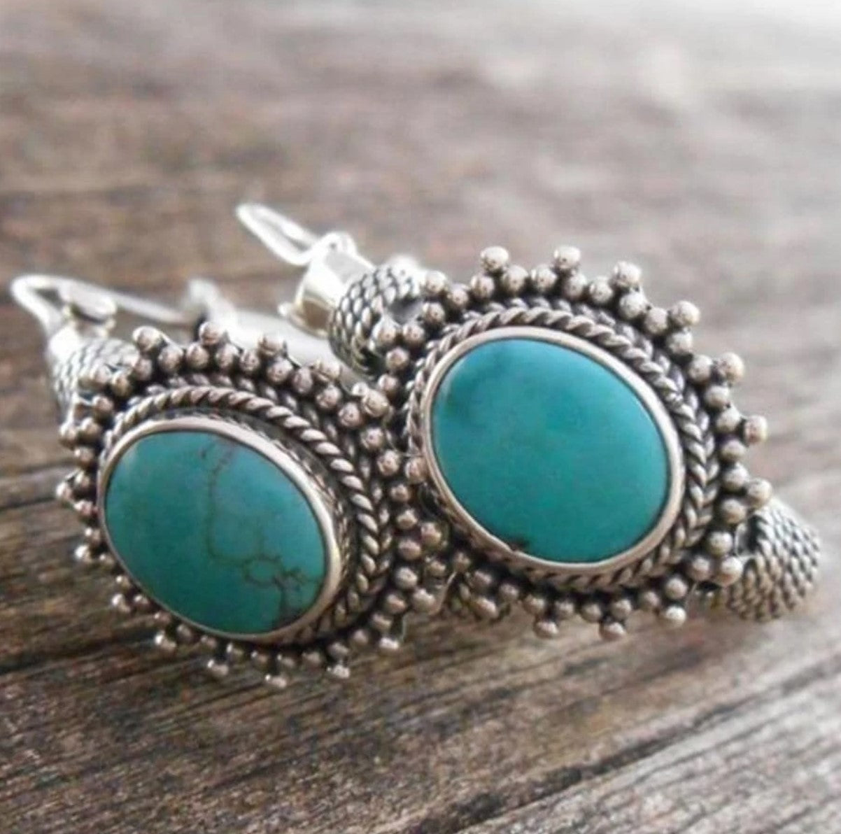 Oval turquoise earrings set in intricate silver frames, adorned with detailed beadwork-timeless and artisanal.