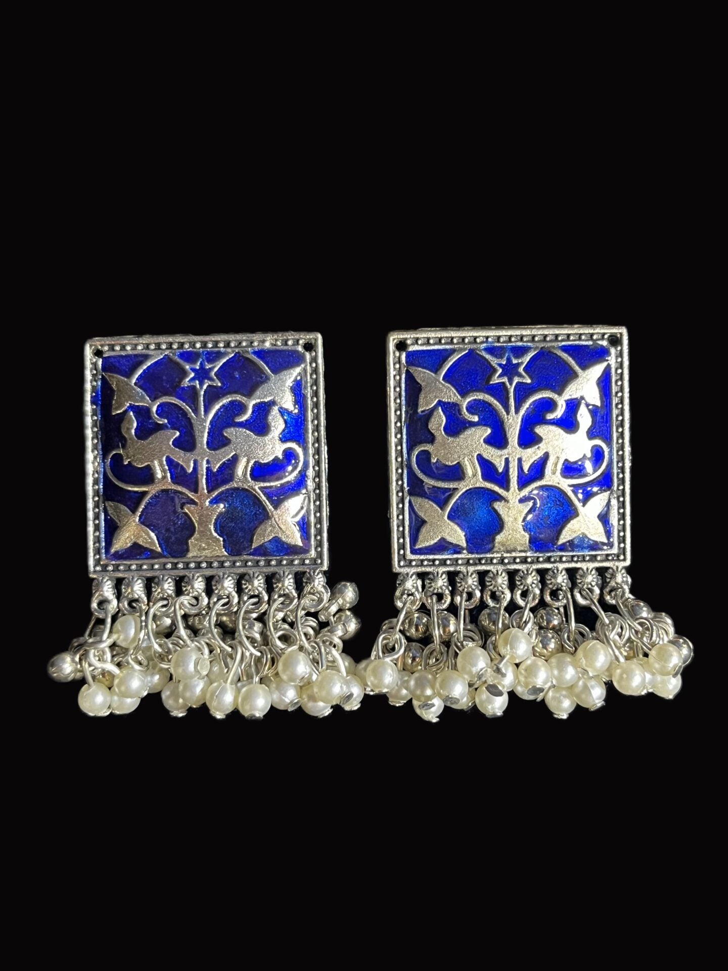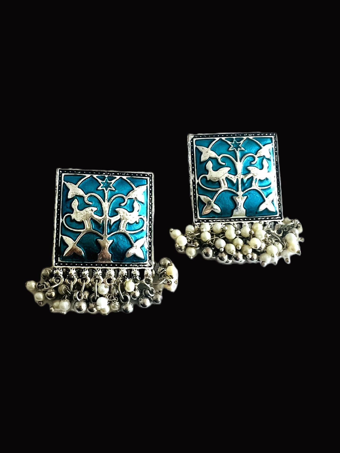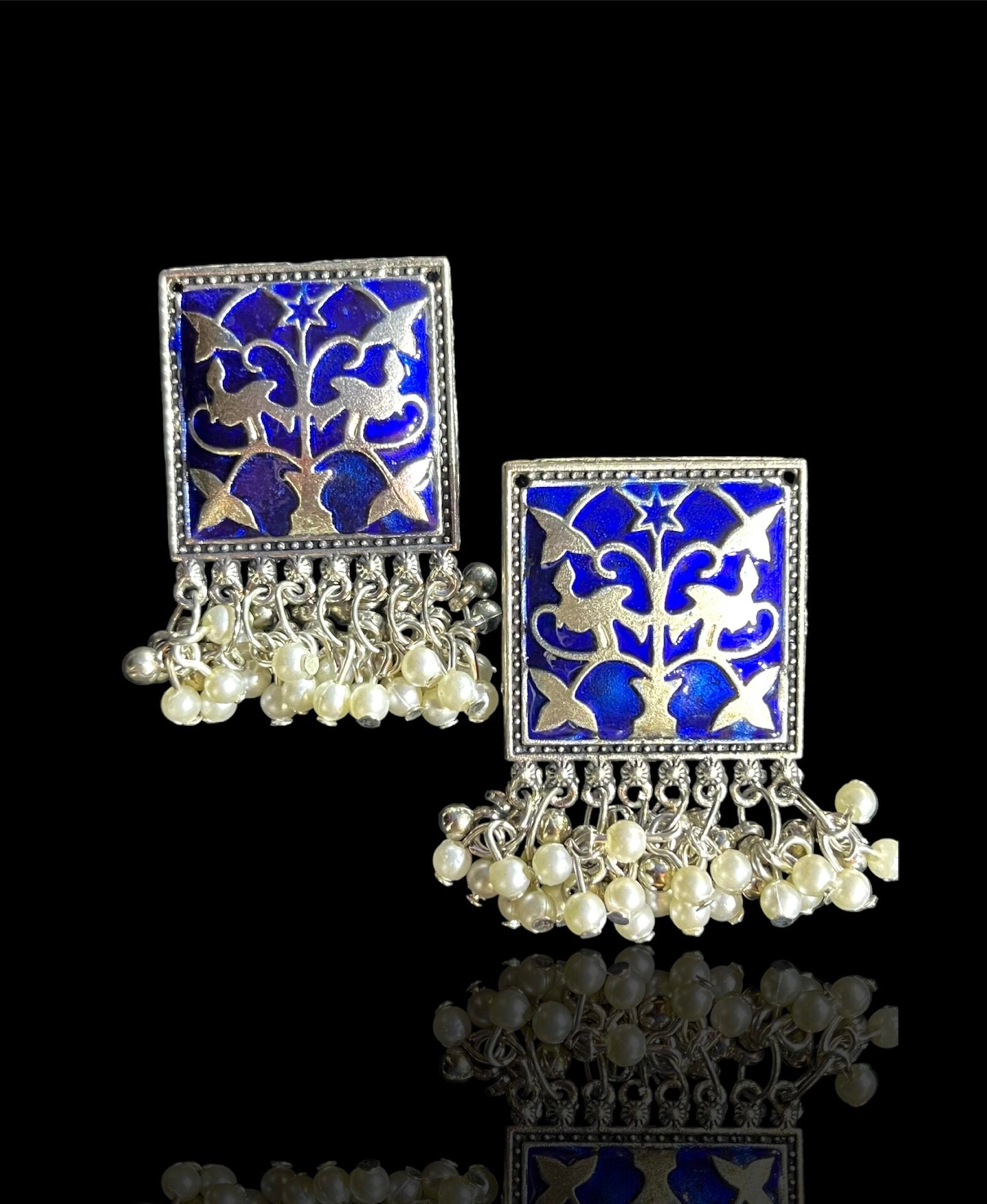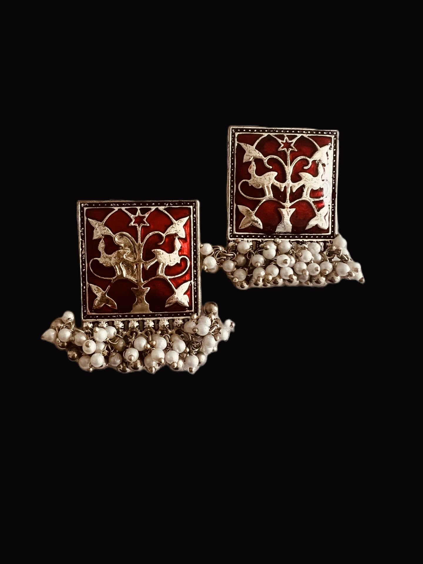 Gold square earrings with intricate floral and bird motifs, accented by pearl drops-ornate and elegant.