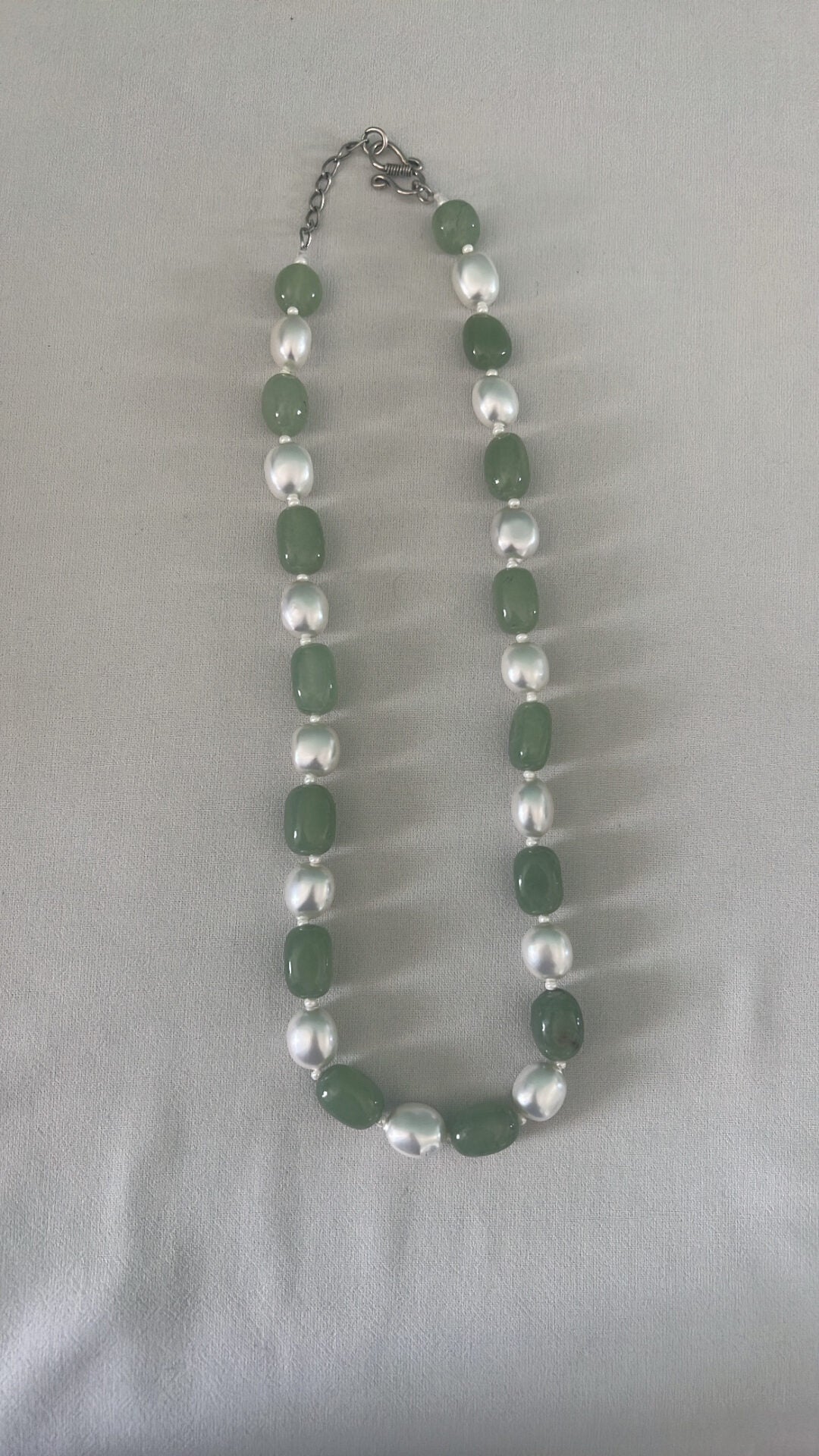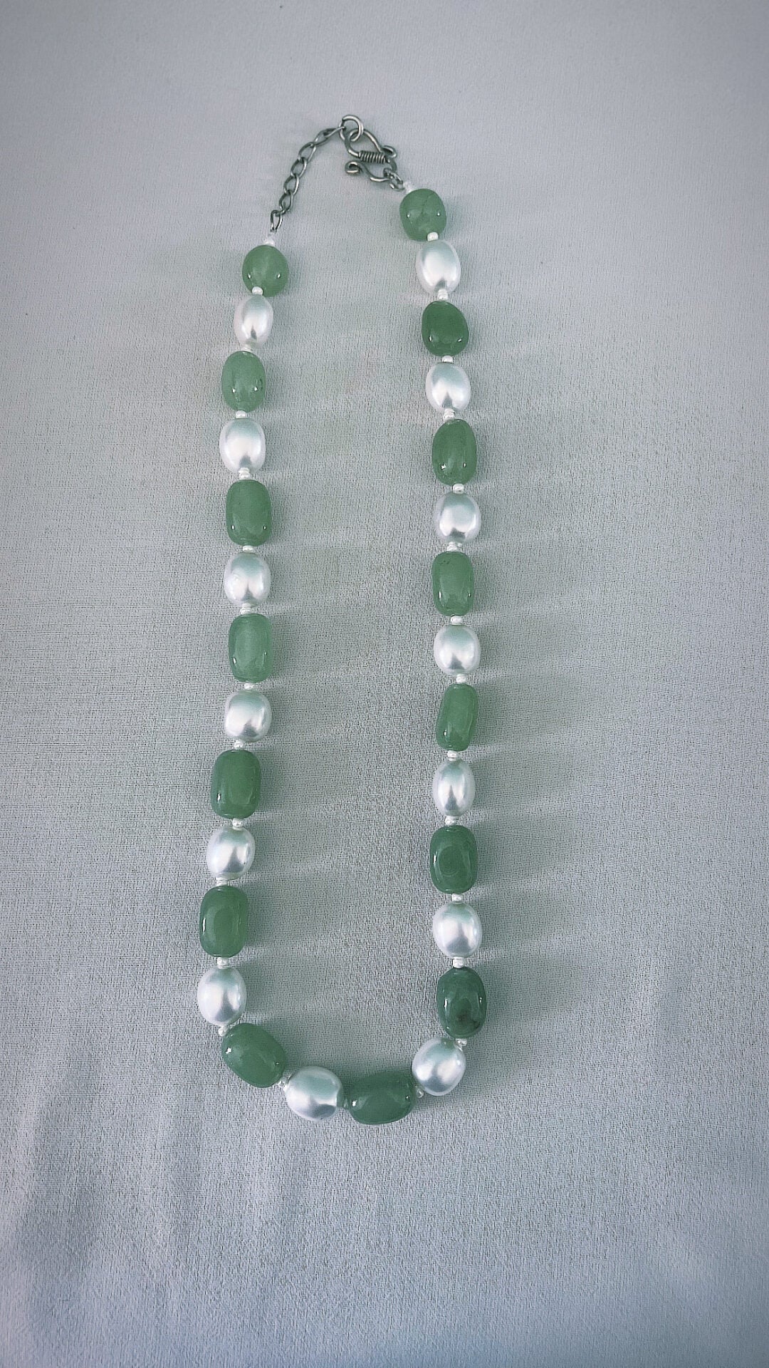An alternating design of green oval beads and white pearl-like accents, this necklace exudes natural elegance.