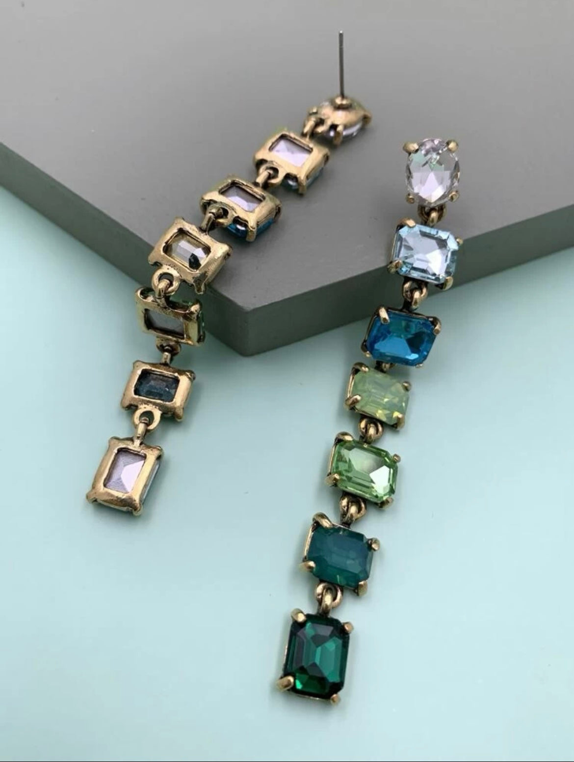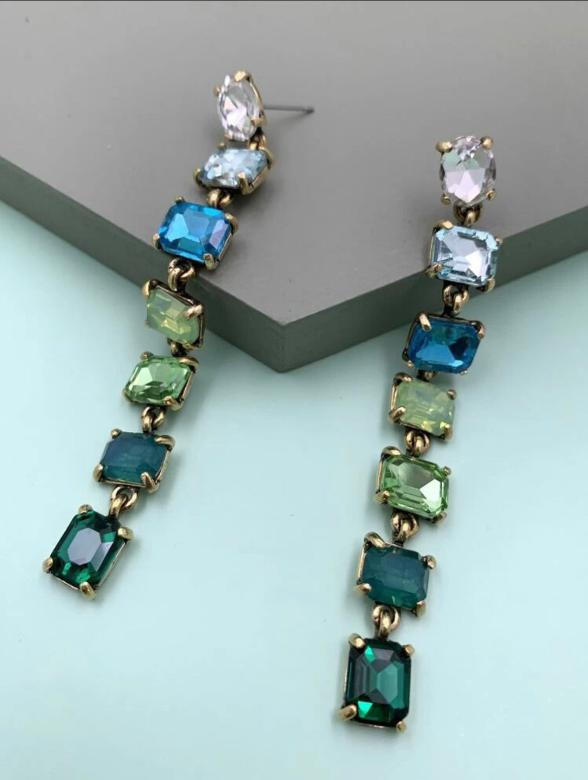 Elegant drop earrings with a gradient of rectangular and oval gemstones in clear, blue, and green tones, set in gold, exuding vibrant sophistication.