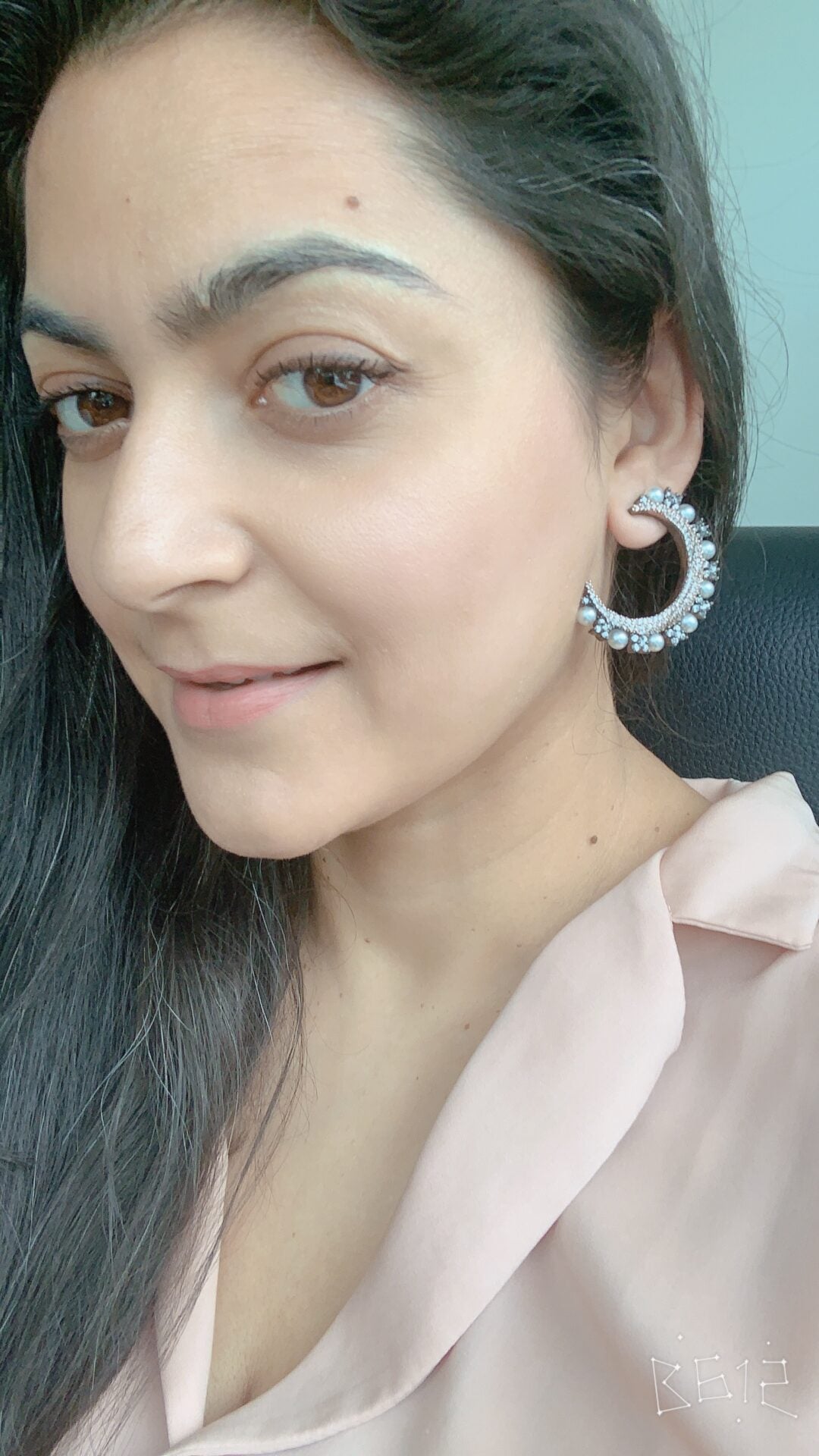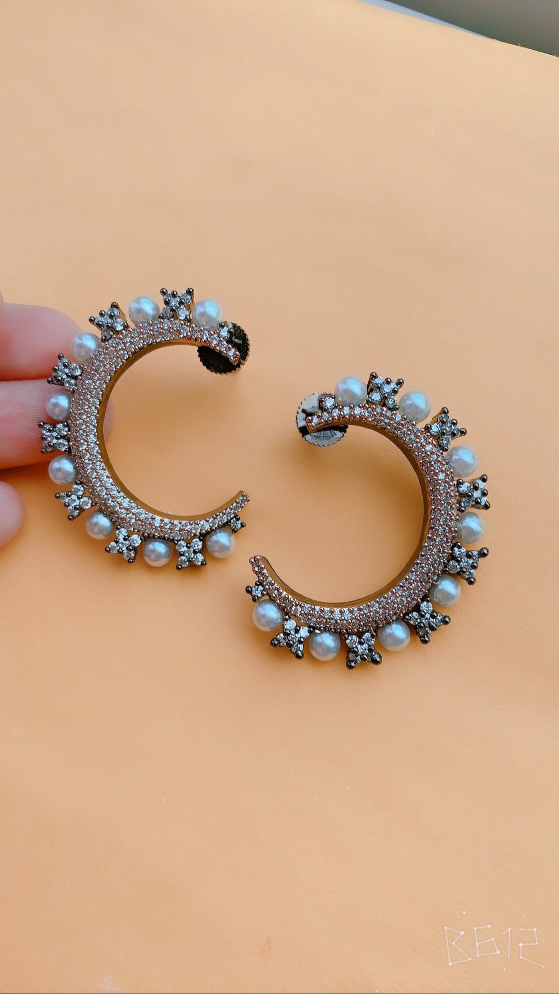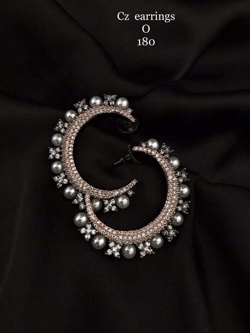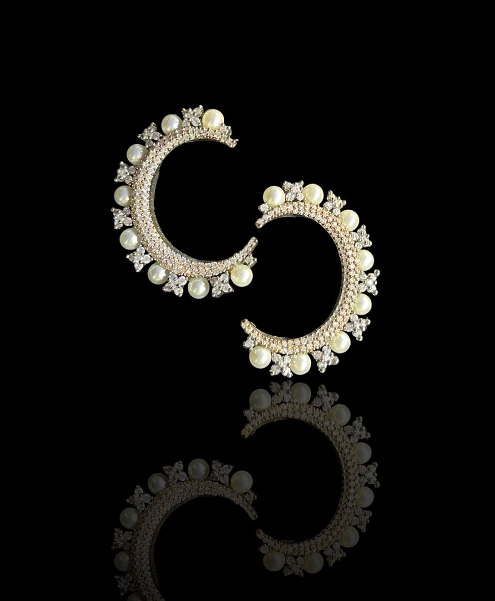 Crescent-shaped earrings adorned with pearls and shimmering stones, showcasing intricate craftsmanship and timeless elegance.