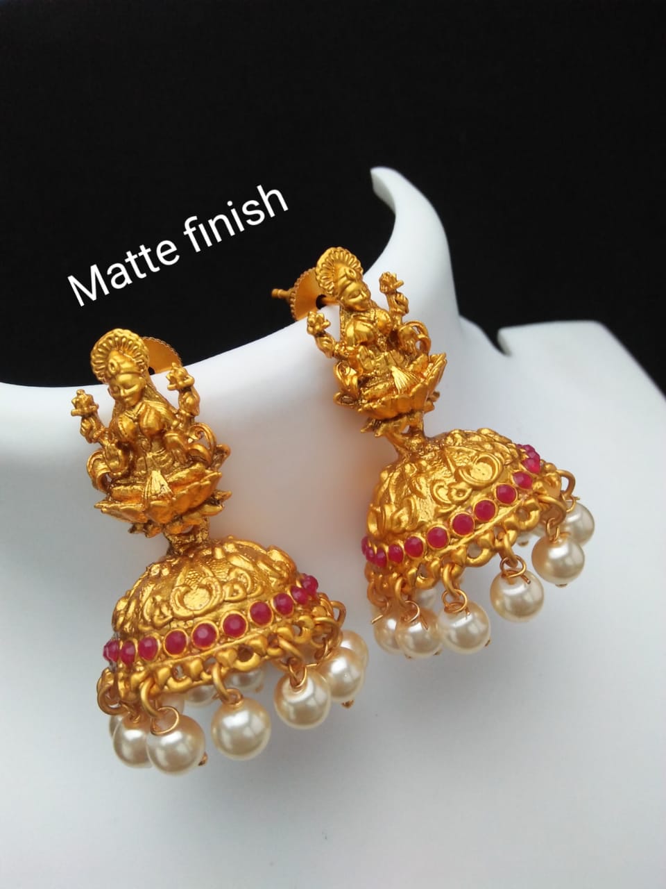 Exquisite gold earrings with a deity motif, radiant red gemstones, and dangling pearl-like beads-an elegant blend of tradition and charm.