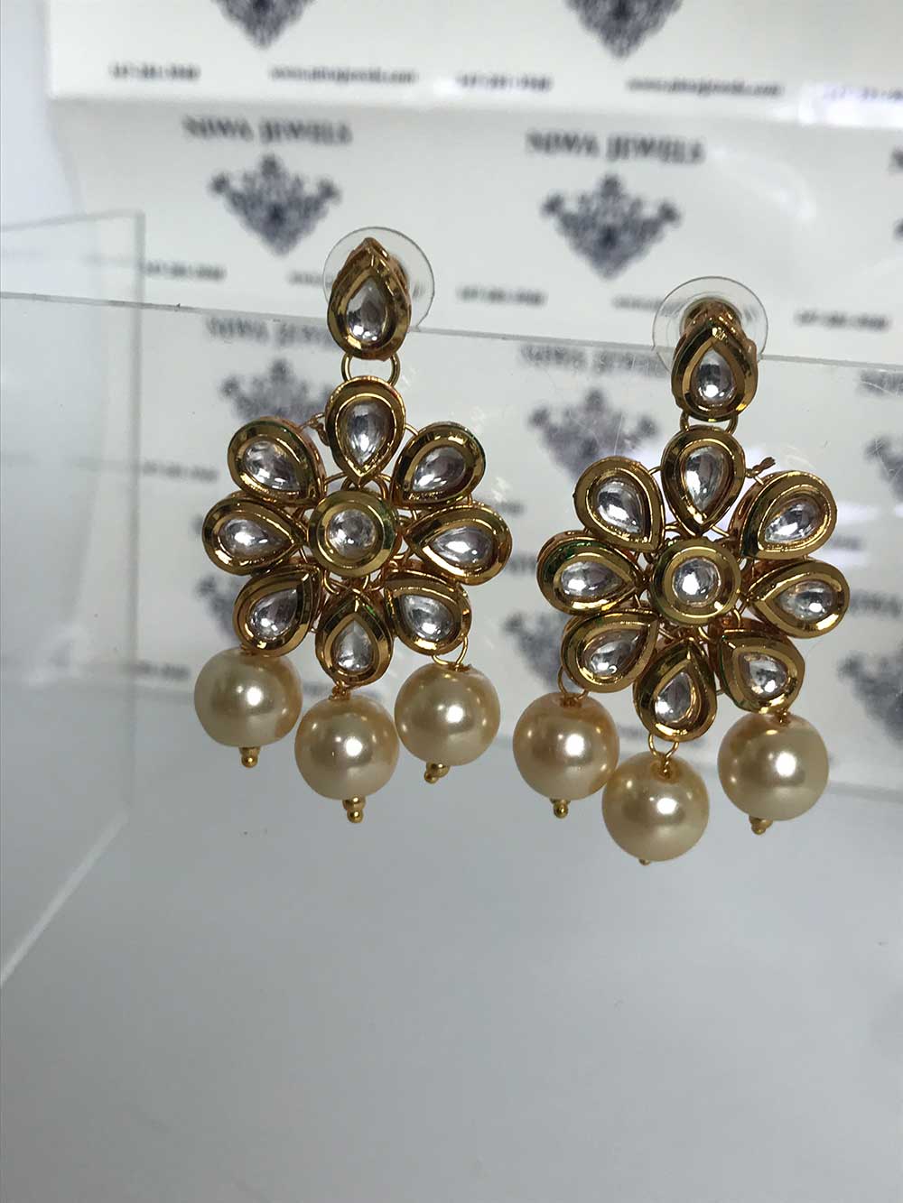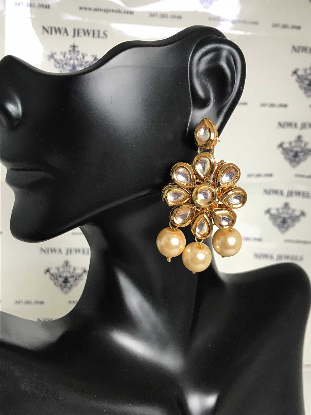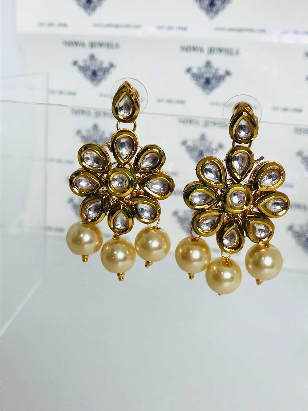 Graceful earrings with a gold floral motif, shimmering stones, and delicate pearl-like beads-a timeless blend of elegance.