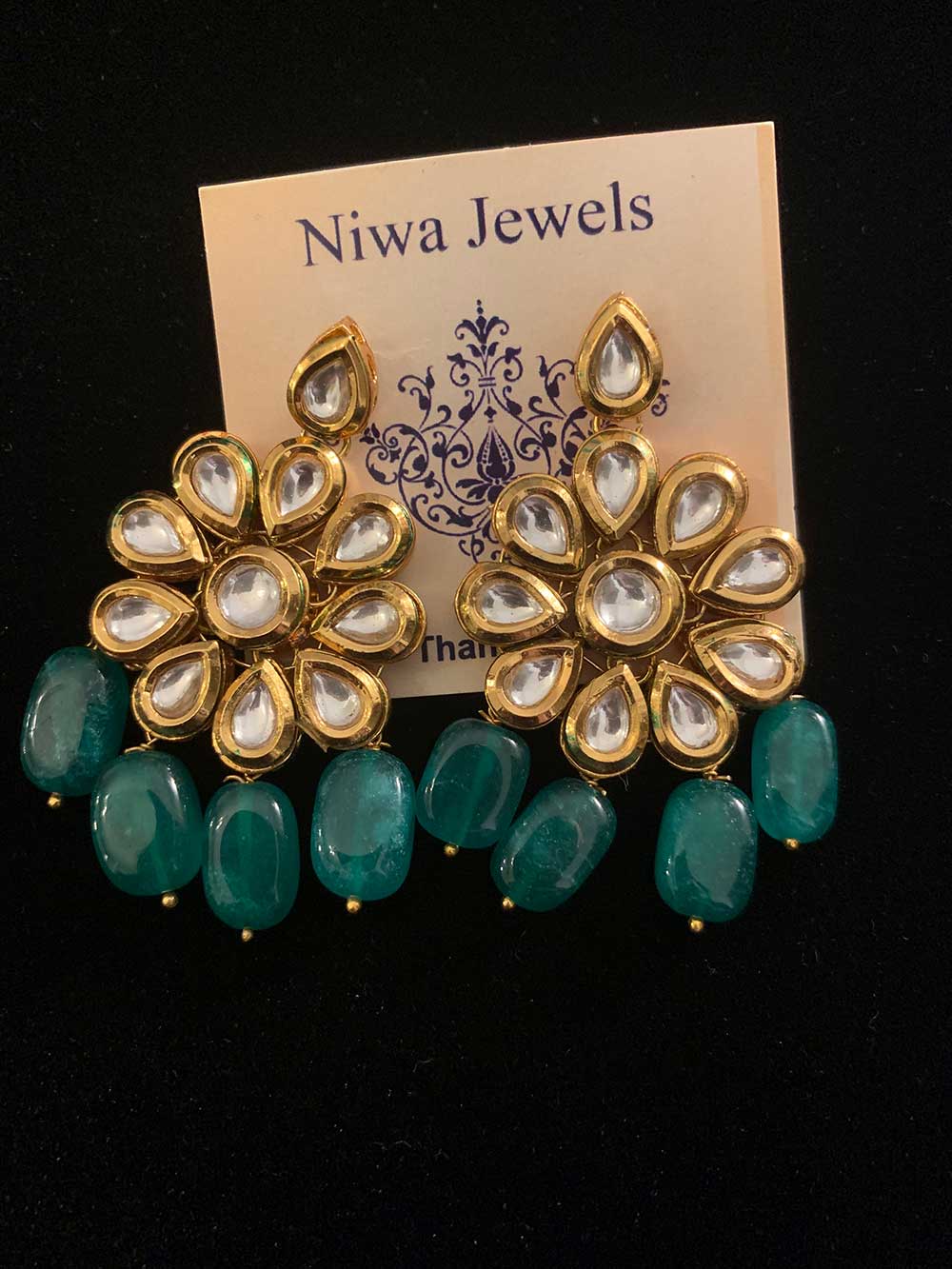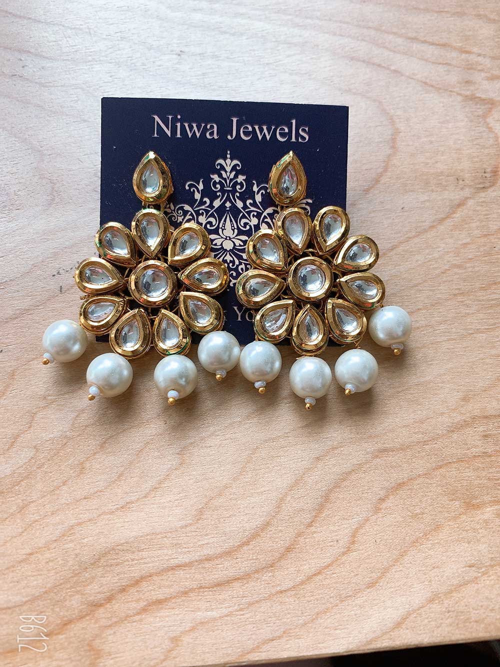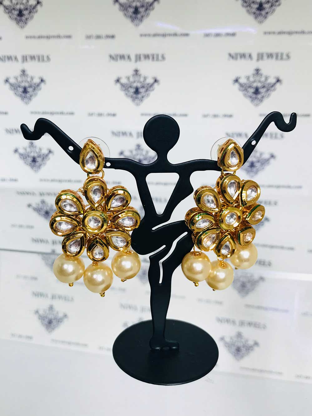 Graceful earrings with a gold floral motif, shimmering stones, and delicate pearl-like beads-a timeless blend of elegance.