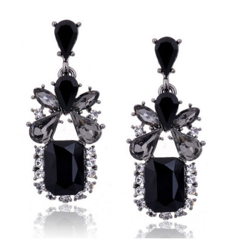 Black gemstones arranged in floral and teardrop designs, accented with smoky gray and clear stones, exuding refined elegance and charm.