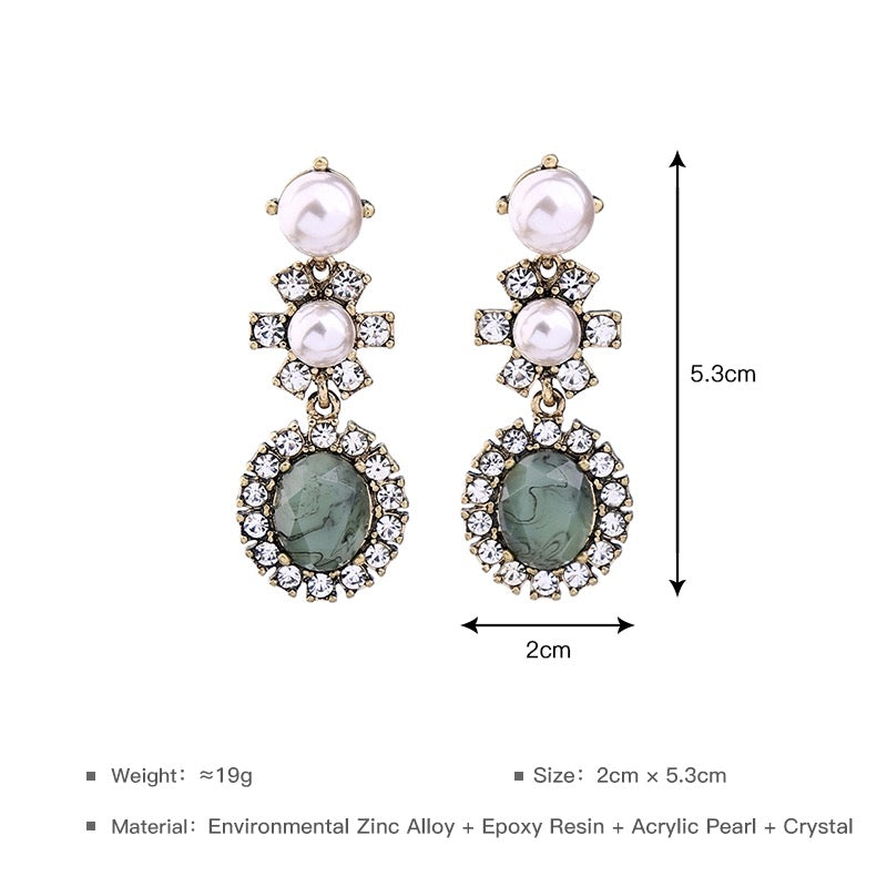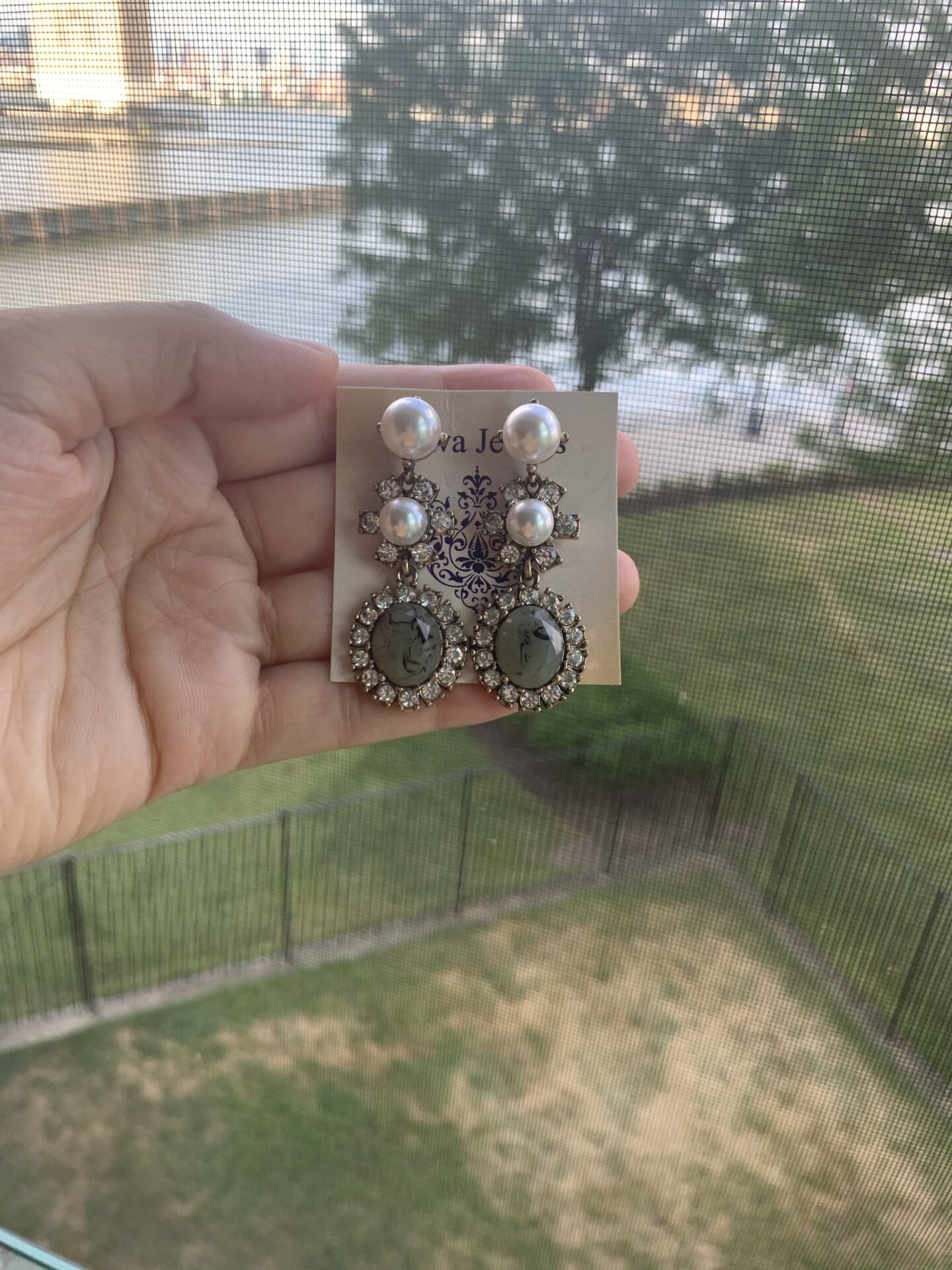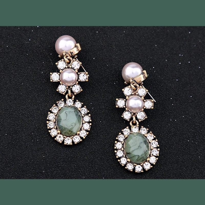 Elegant earrings adorned with pearls, crystals, and vibrant green gems-a perfect blend of sophistication and charm.