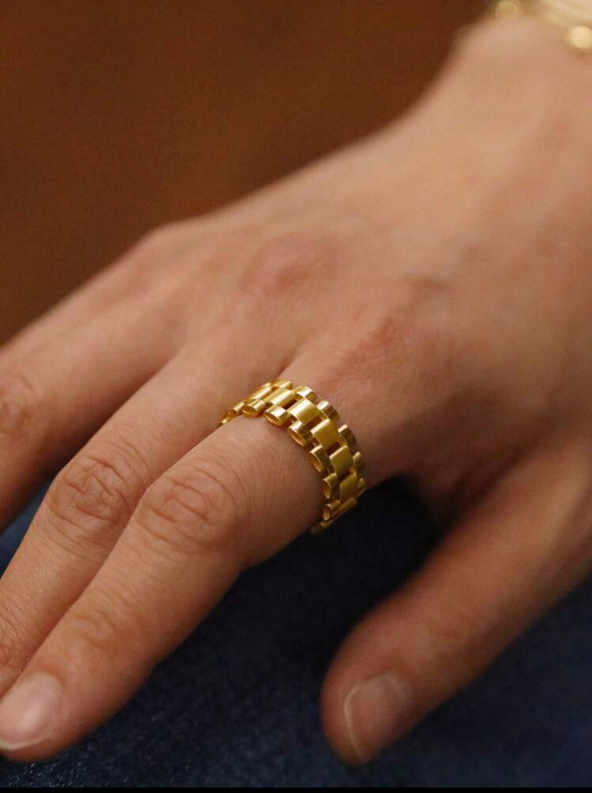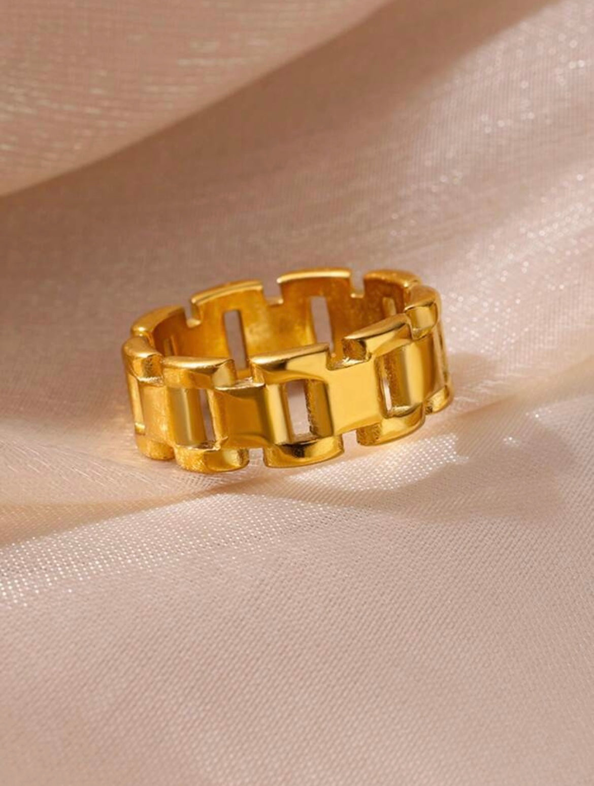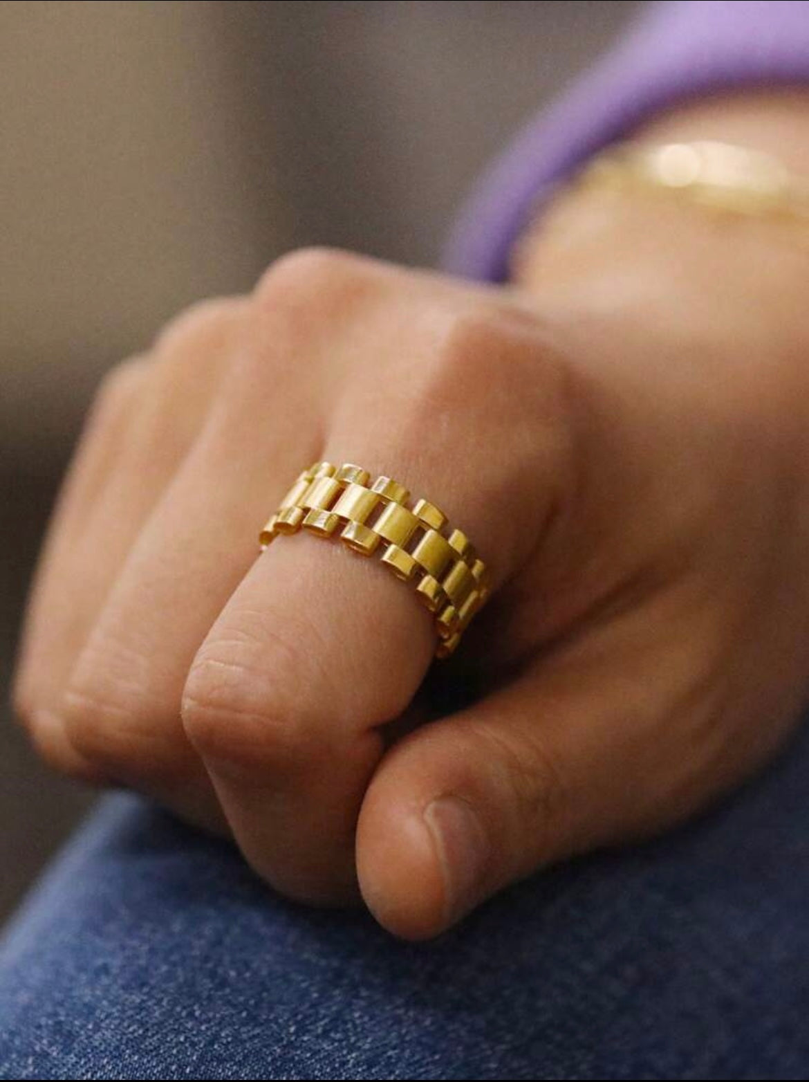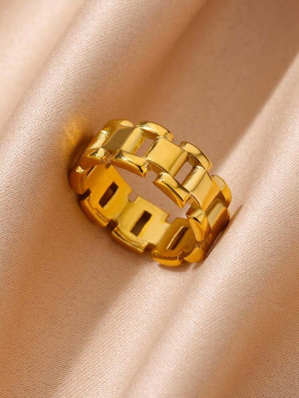 The ring is gold-toned chain link ring, made of rectangular links connected to form a band and has a shiny finish.