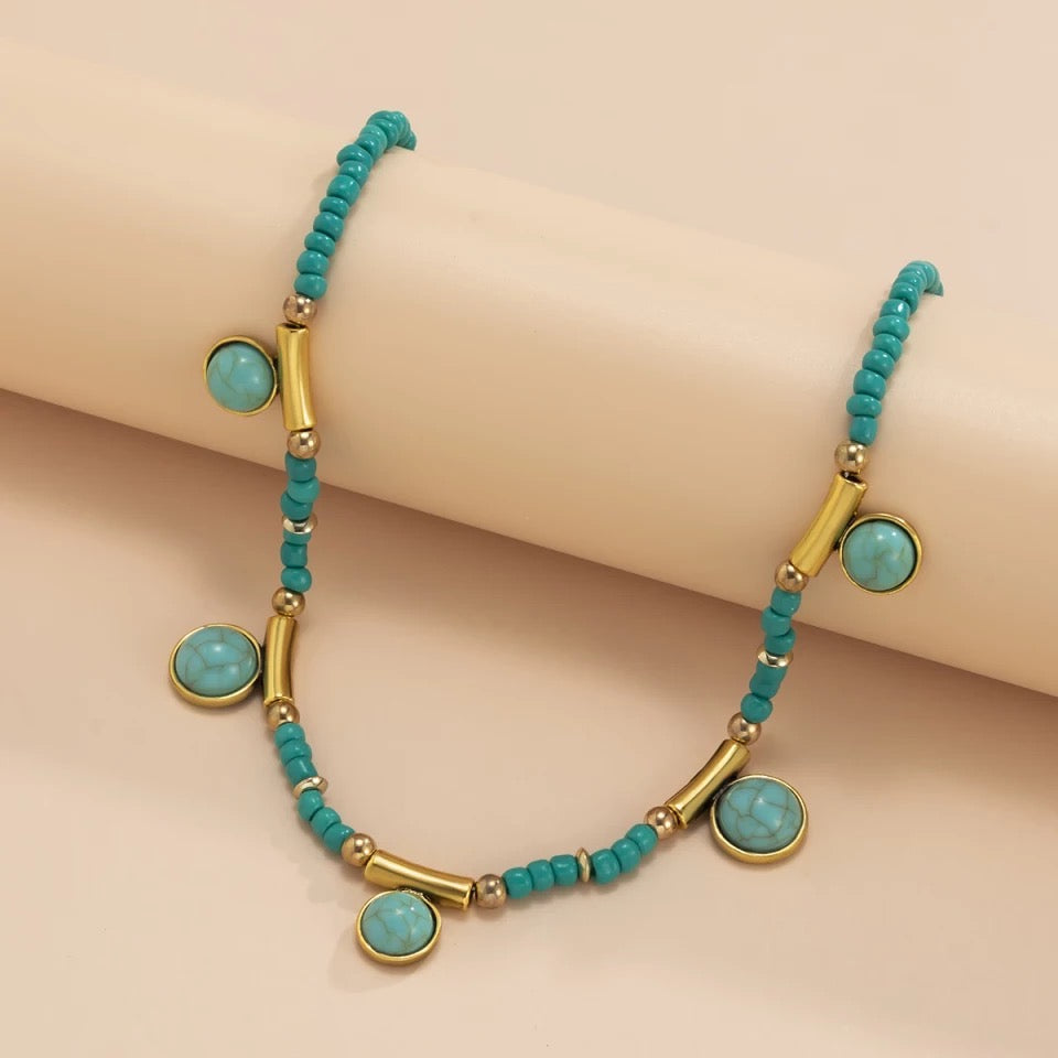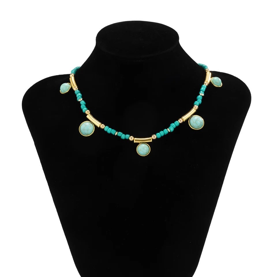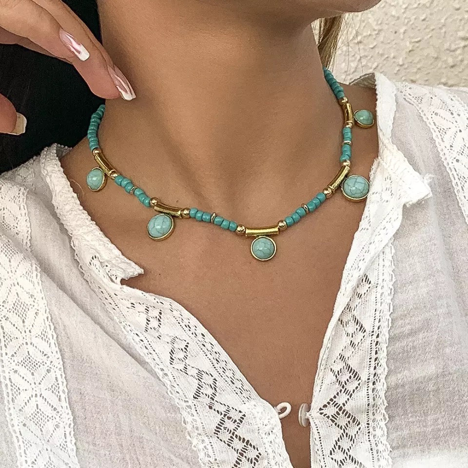A layered green beaded necklace adorned with gold charms, paired with a pendant chain, blending elegance and intricate detail.