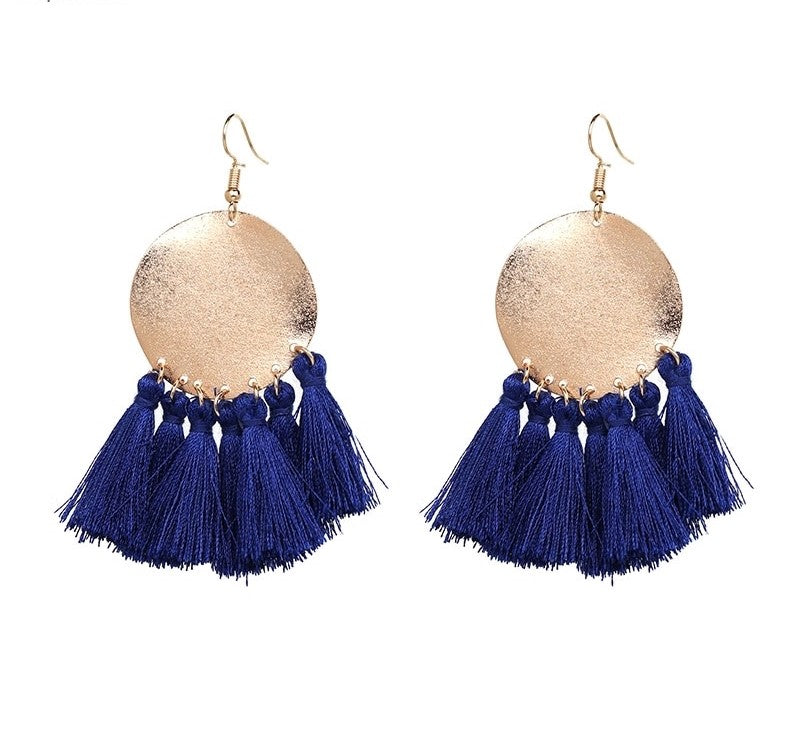 Bold round gold-tone earrings adorned with deep blue tassels, blending playful movement with striking sophistication.